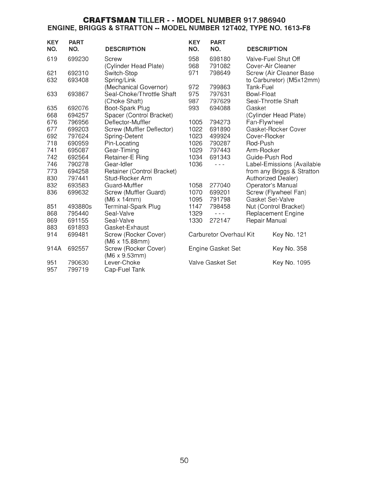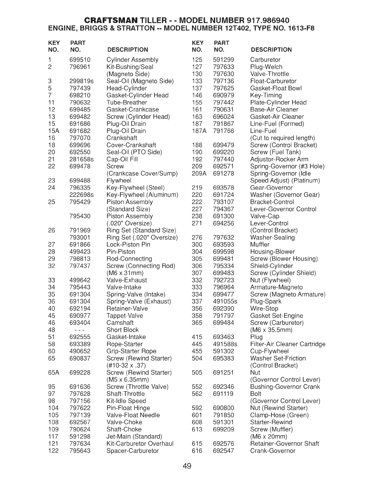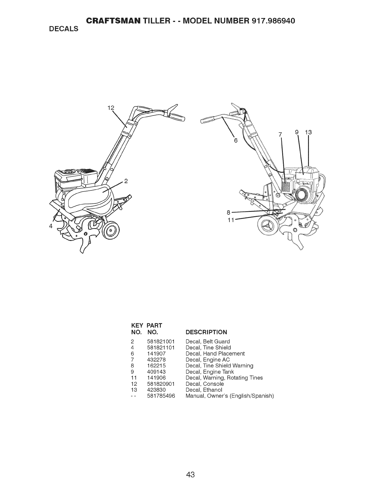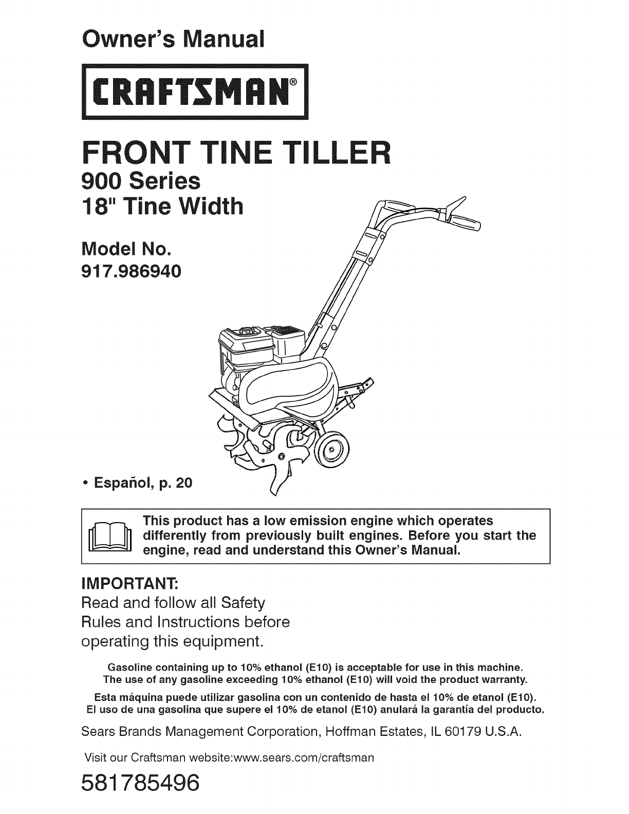 User Manual: Craftsman 917986940 917986940 CRAFTSMAN TILLER - Manuals and Guides View the owners manual for your CRAFTSMAN TILLER #917986940. Home:Lawn & Garden Parts:Craftsman Parts:Craftsman TILLER Manual