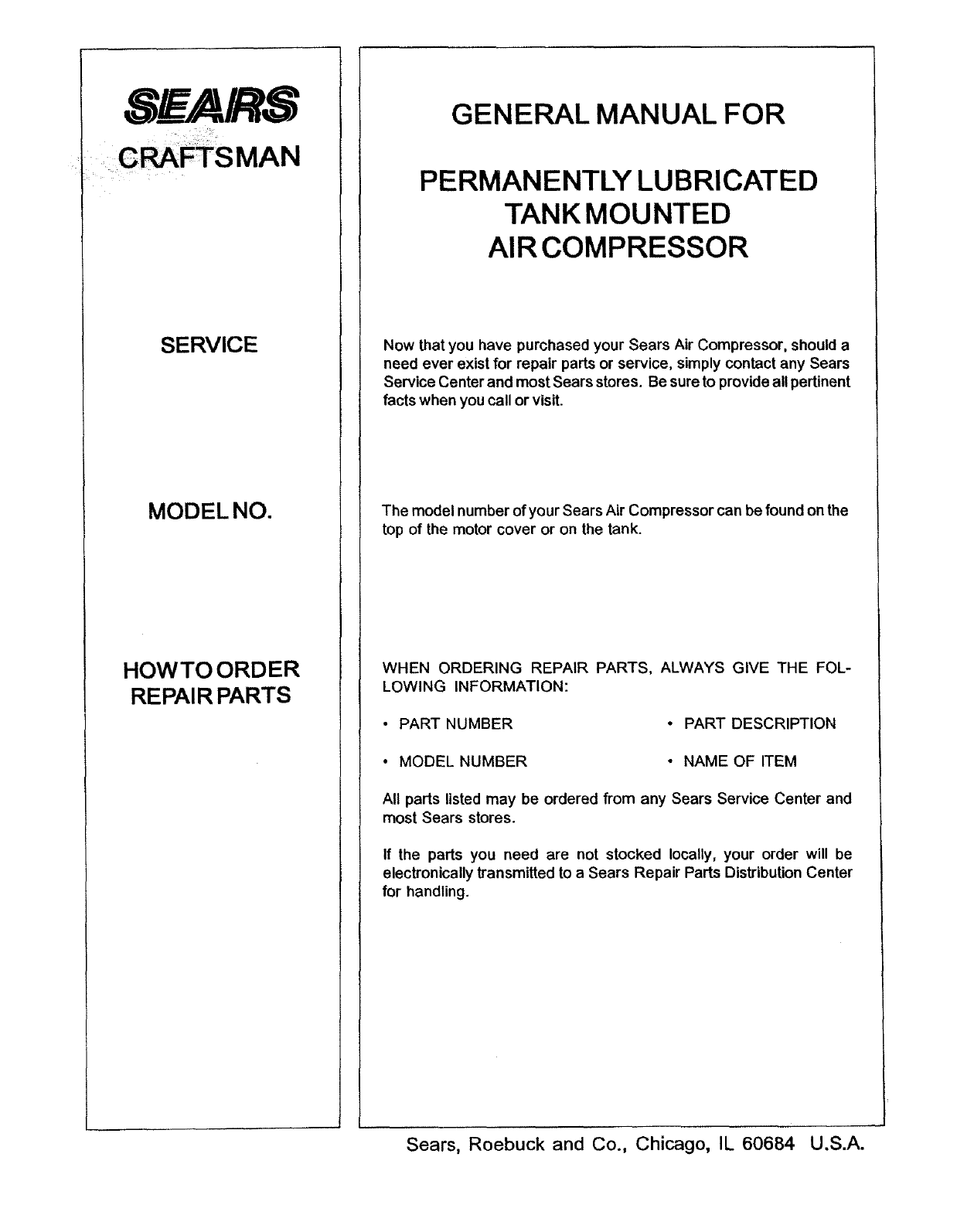User Manual: Craftsman 919152910 919152910 CRAFTSMAN AIR COMPRESSOR - Manuals and Guides View the owners manual for your CRAFTSMAN AIR COMPRESSOR #919152910. Home:Tool Parts:Craftsman Parts:Craftsman AIR COMPRESSOR Manual