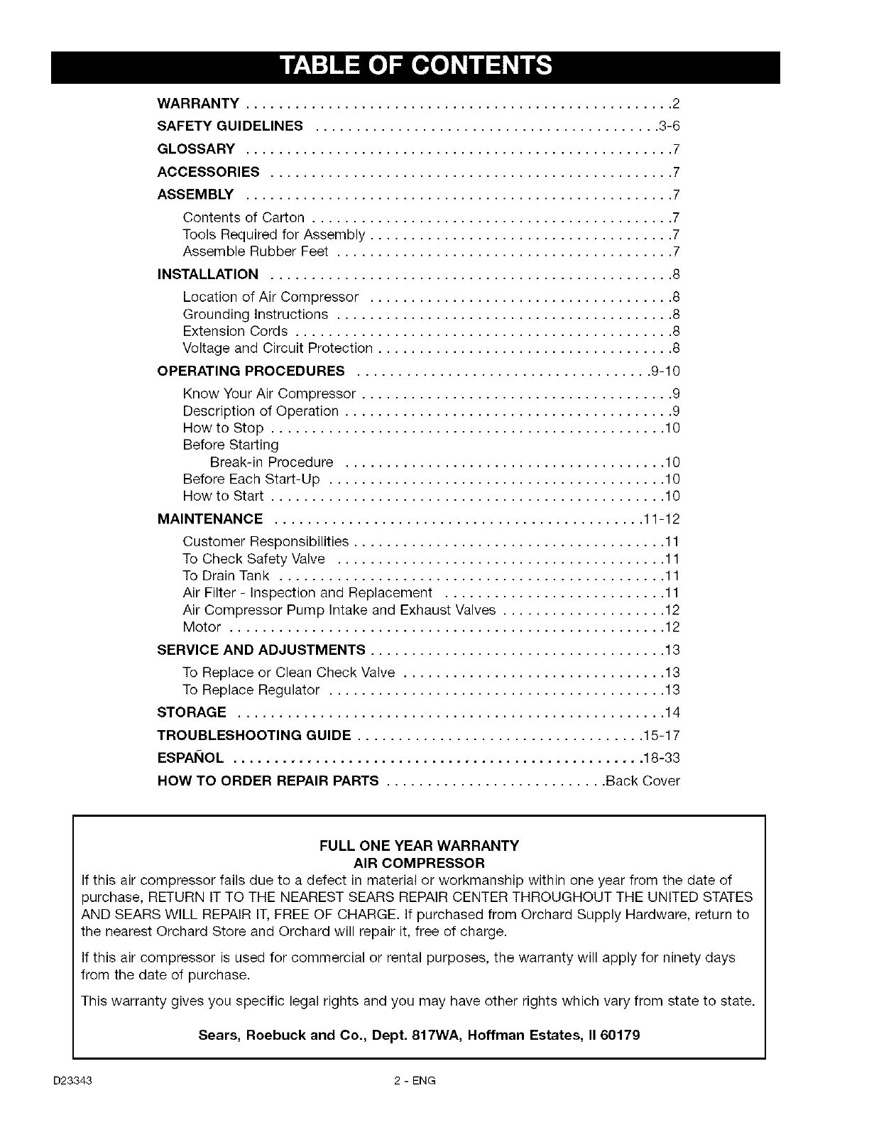 Craftsman 919167360 User Manual AIR COMPRESSOR Manuals And Guides L0807071