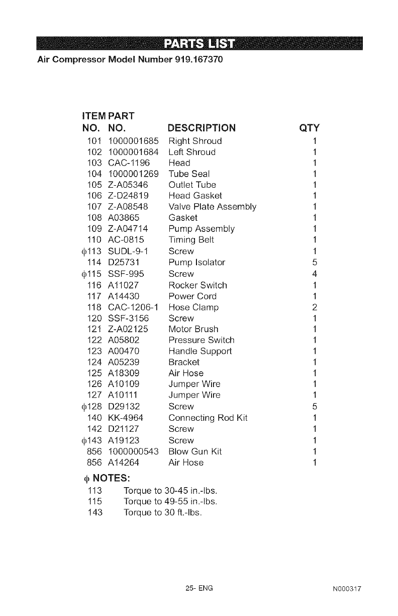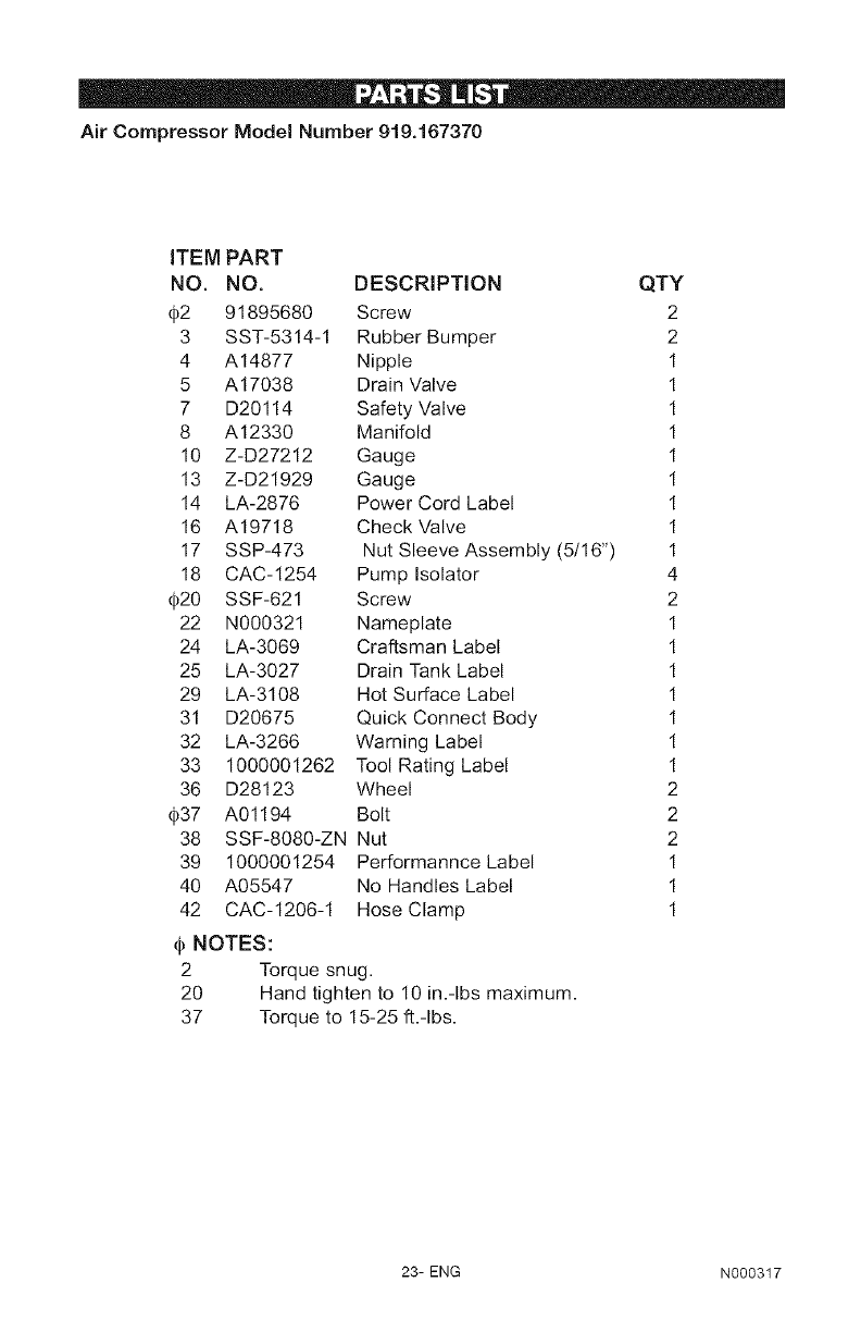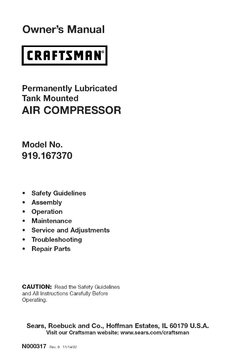 User Manual: Craftsman 919167370 919167370 CRAFTSMAN AIR COMPRESSOR - Manuals and Guides View the owners manual for your CRAFTSMAN AIR COMPRESSOR #919167370. Home:Tool Parts:Craftsman Parts:Craftsman AIR COMPRESSOR Manual