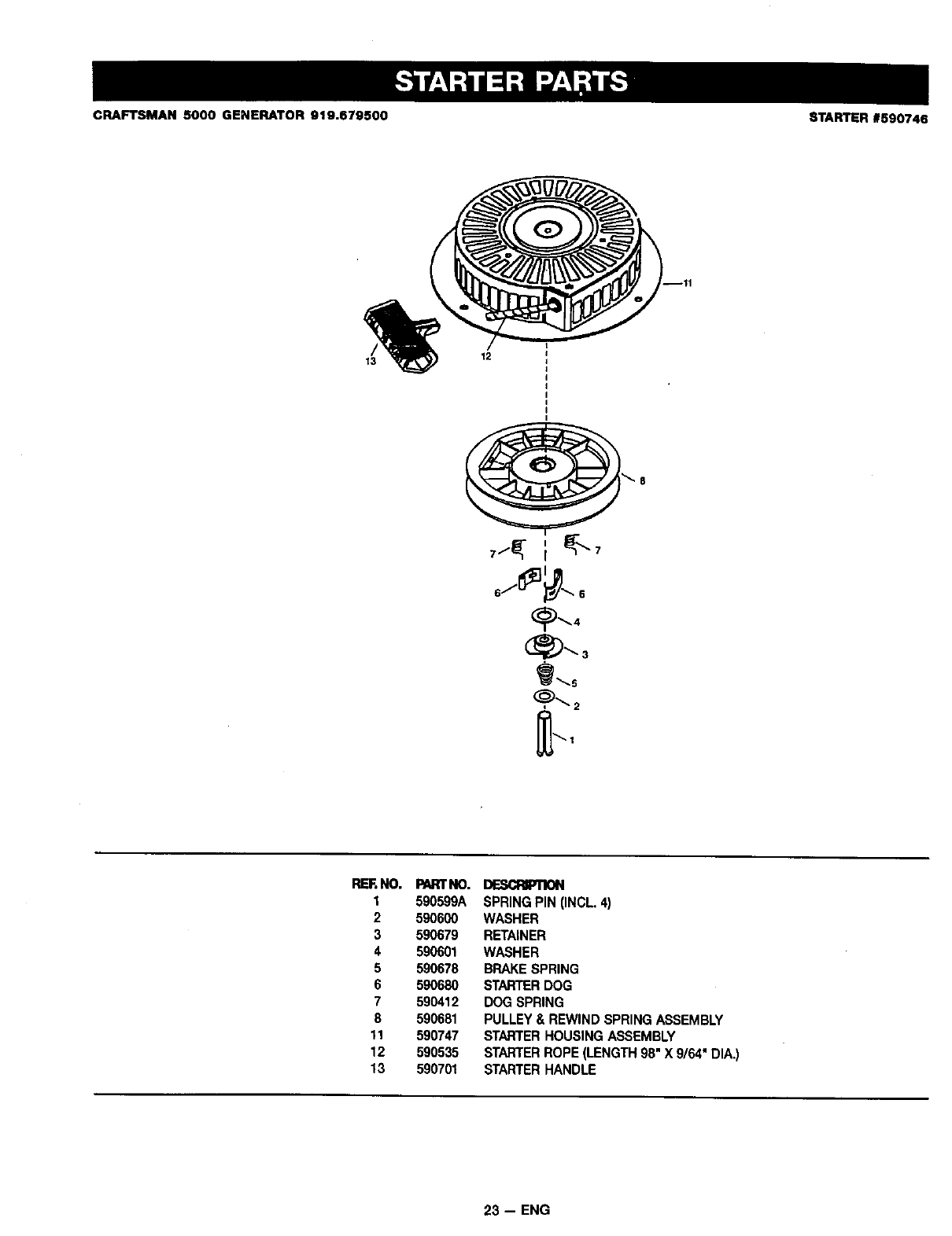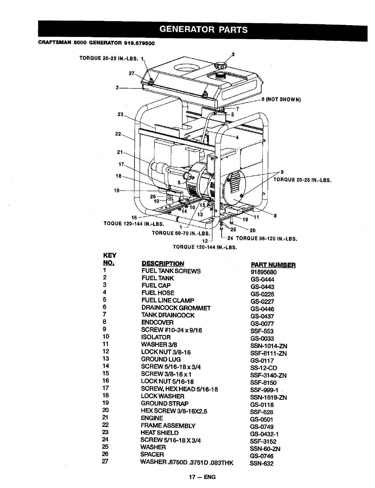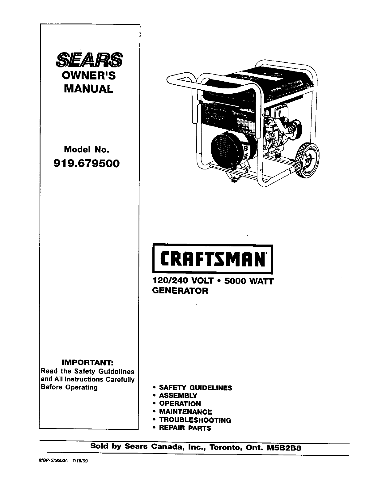 User Manual: Craftsman 919679500 919679500 CRAFTSMAN GENERATOR - Manuals and Guides View the owners manual for your CRAFTSMAN GENERATOR #919679500. Home:Tool Parts:Craftsman Parts:Craftsman GENERATOR Manual