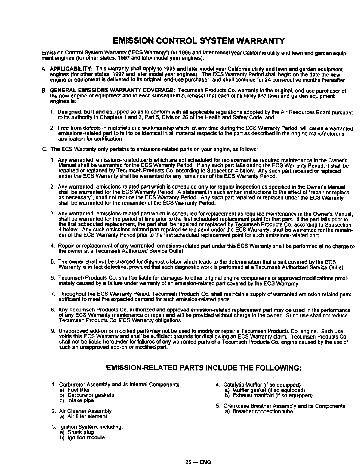 B, GENERAL EMISSIONS WARRANTY COVERAGE: Tecumseh Products Co. warrants to the original, end-use purchaser of