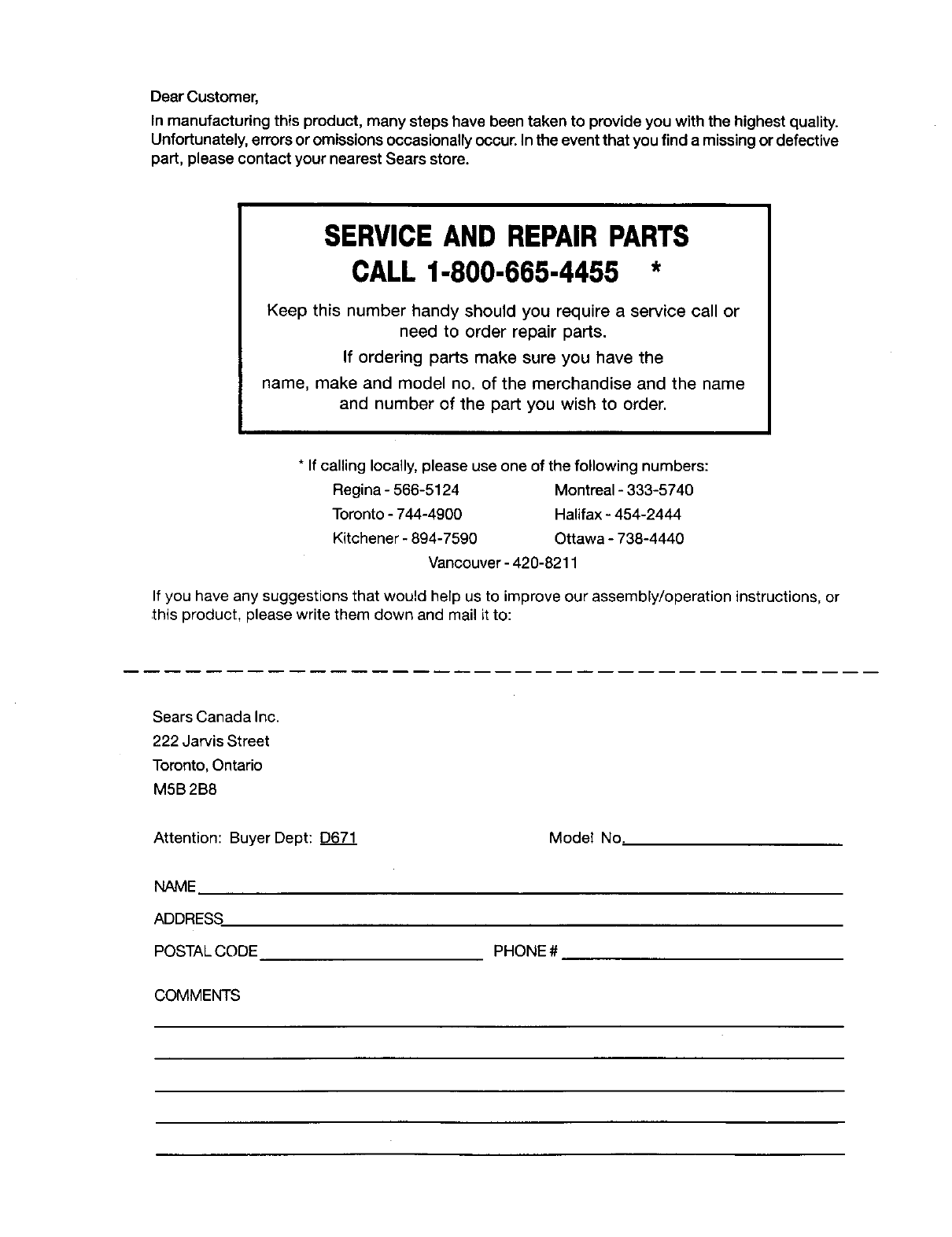 Sold by Sears Canada, Inc., Toronto, Ont. M5B2B8