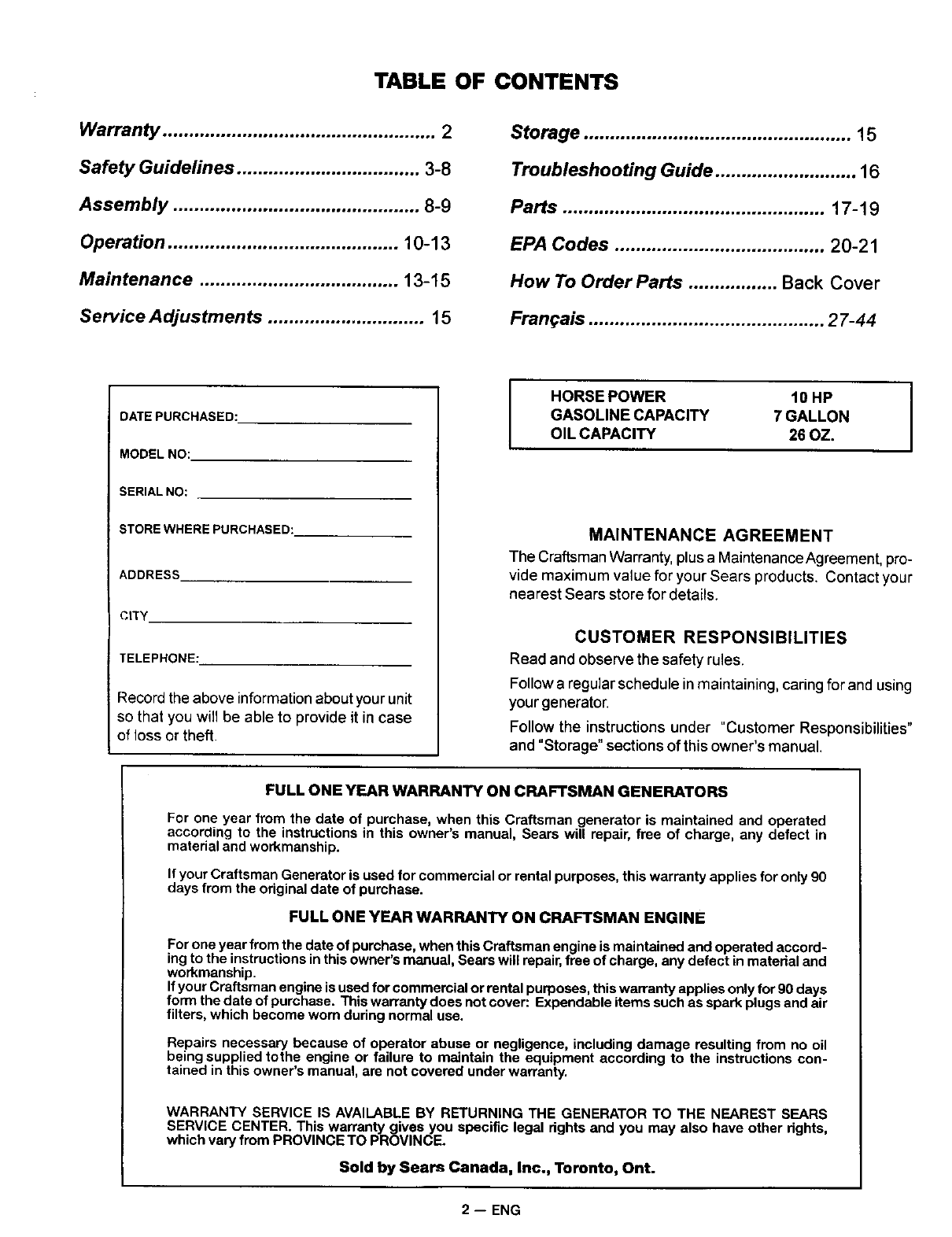 For one year from the date of purchase, when this Craftsman engine is maintained and operated accord-