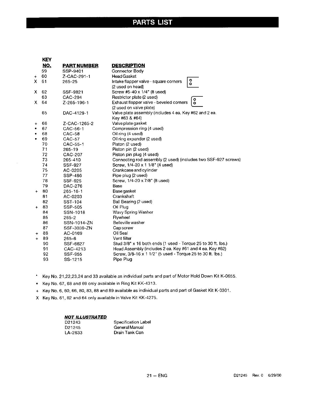 + Key No. 6, 60, 66, 80, 83, 88 and 89 available as individual parts and part of Gasket Kit K-0301.