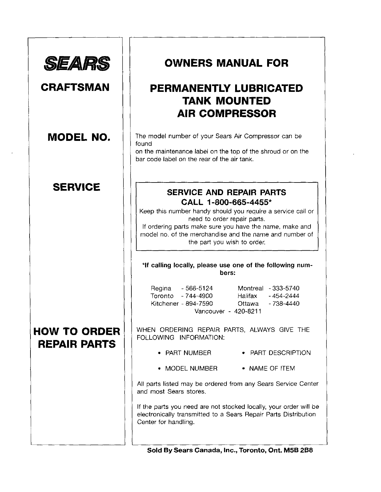 Sold by Sears Canada, Inc., Toronto, Ont. M5B 2B8