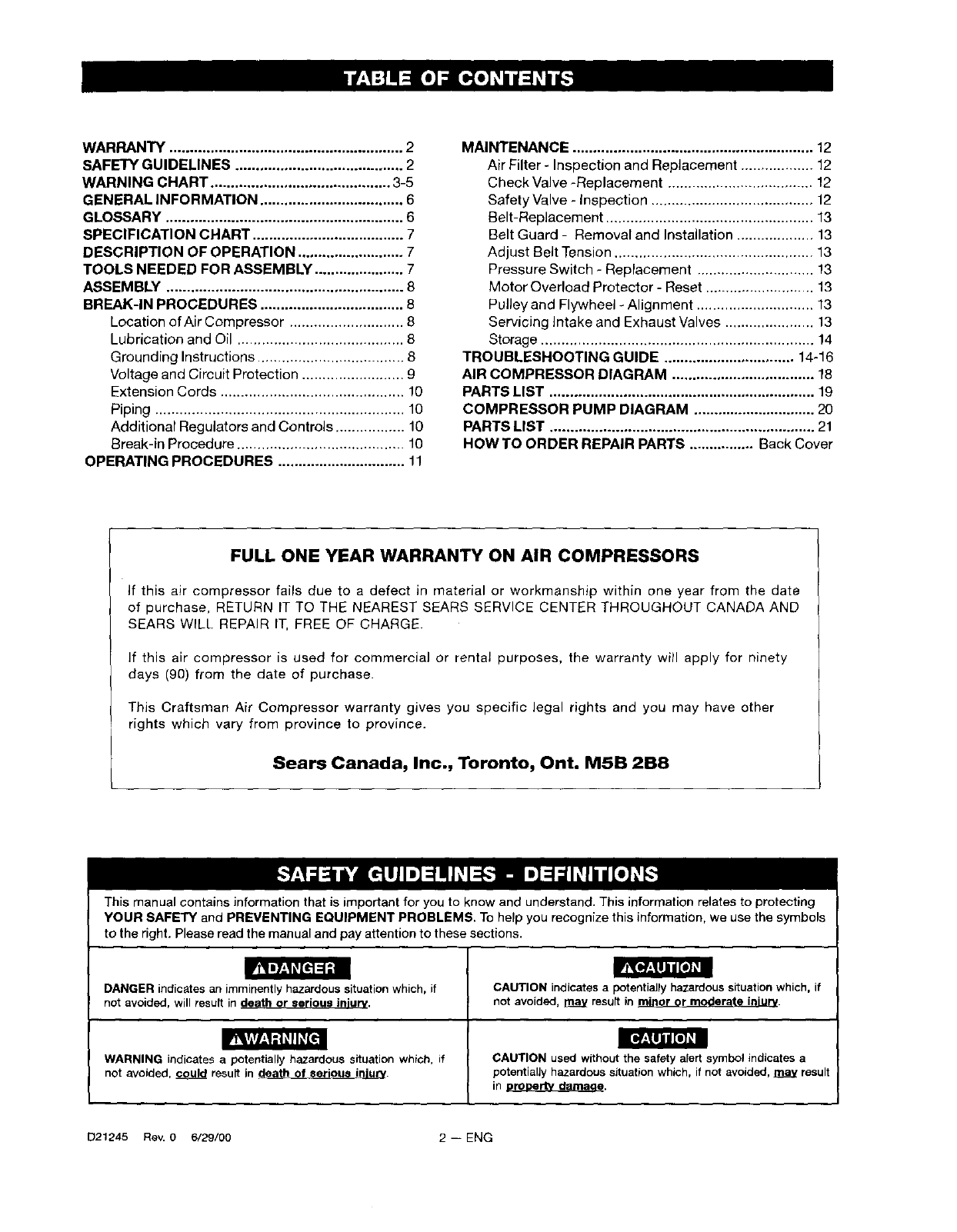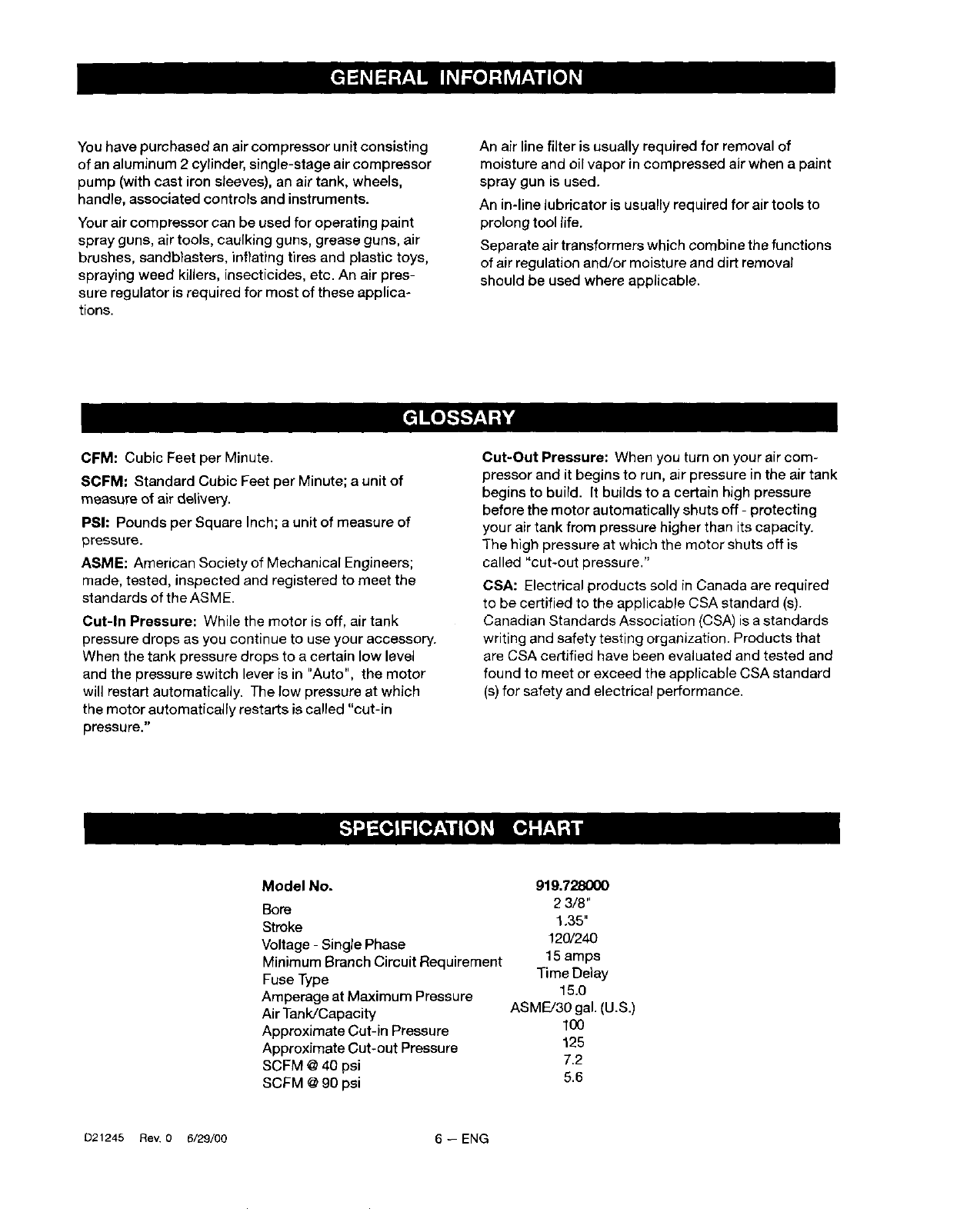 Craftsman 919728000 User Manual OPERATORS AIR COMPRESSOR Manuals And Guides L0101269