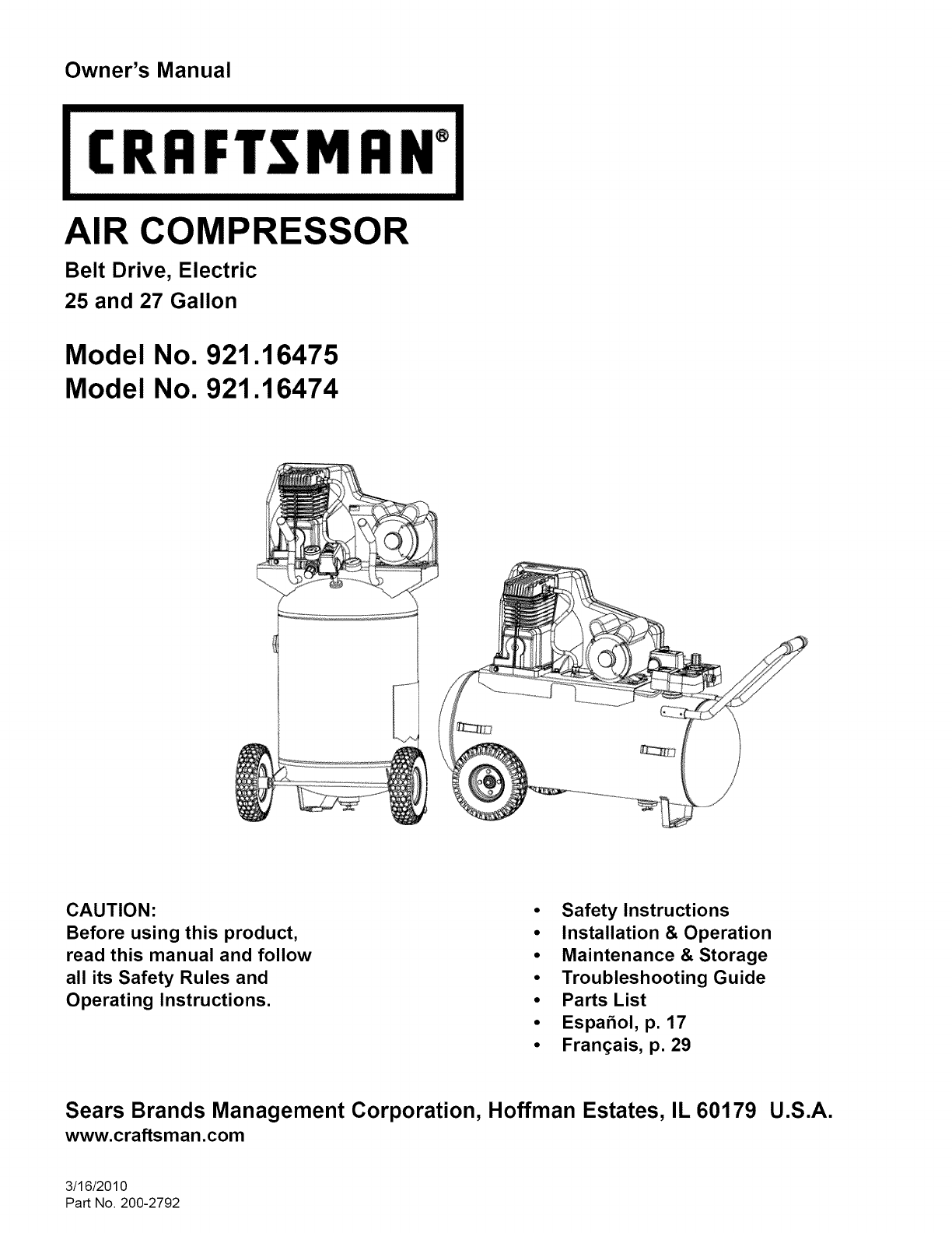 User Manual: Craftsman 92116474 92116474 CRAFTSMAN COMPRESSOR - Manuals and Guides View the owners manual for your CRAFTSMAN COMPRESSOR #92116474. Home:Tool Parts:Craftsman Parts:Craftsman COMPRESSOR Manual