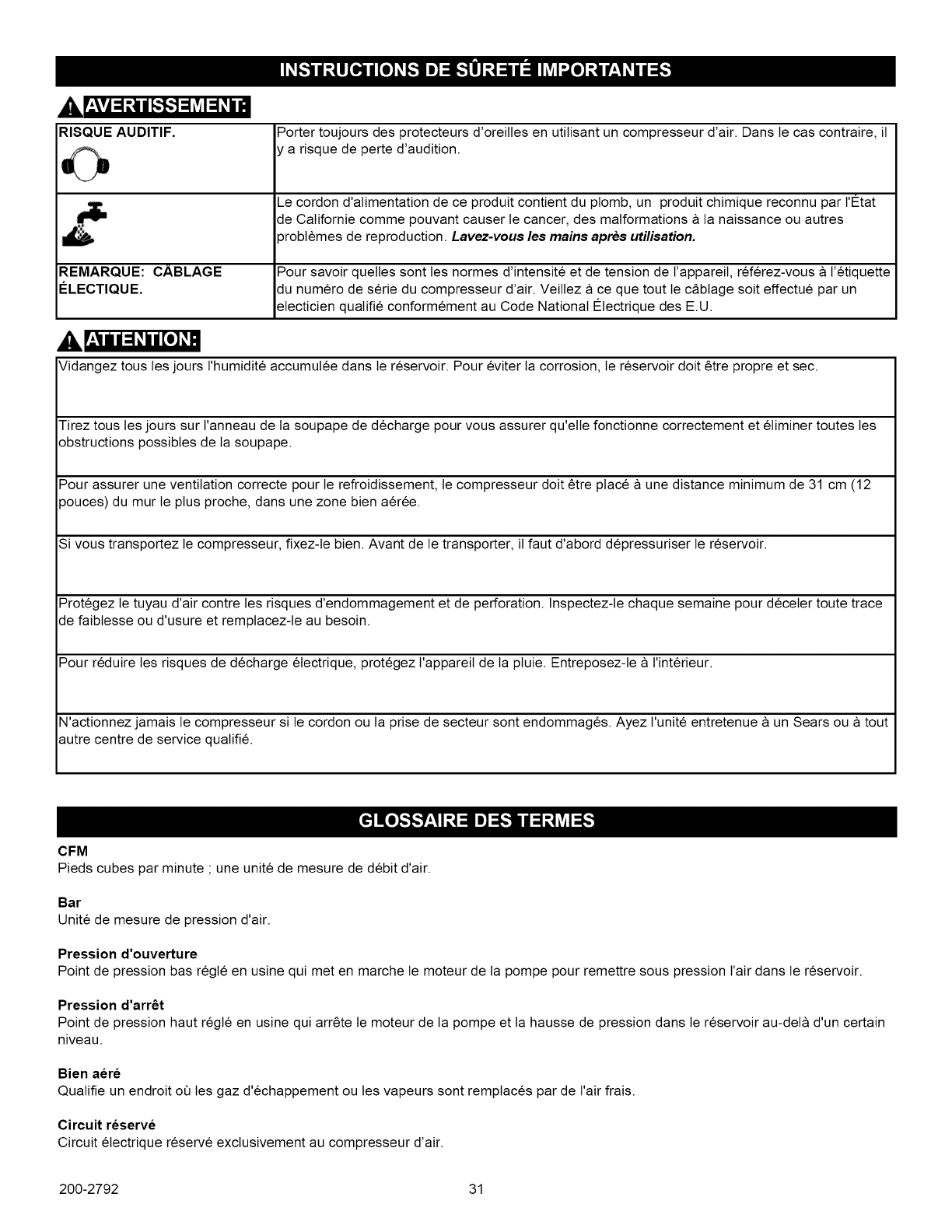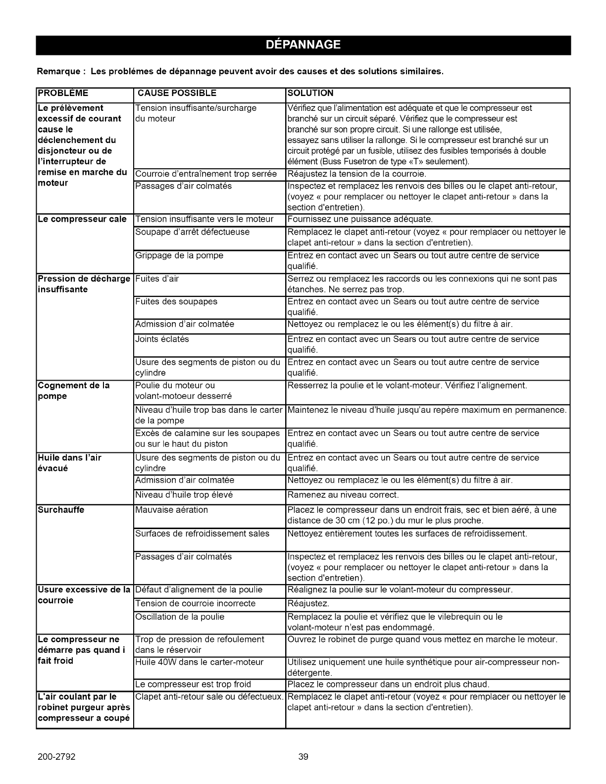 Huile dans I'air Usure des segments de piston ou du Entrez en contact avec un Sears ou tout autre centre de service