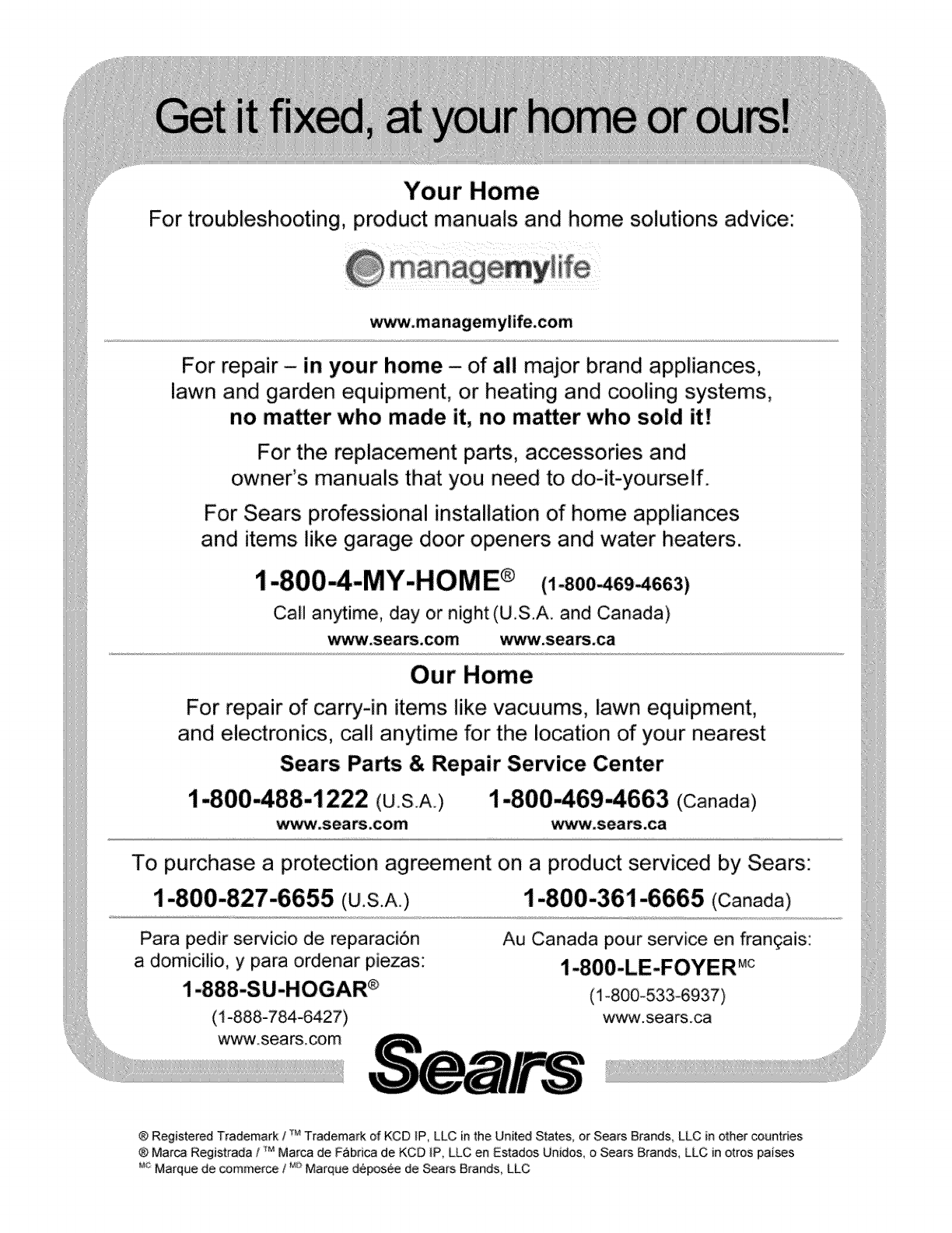 ® Registered Trademark !Trademark of KCD IP, LLC in the United States, or Sears Brands, LLC in other countries