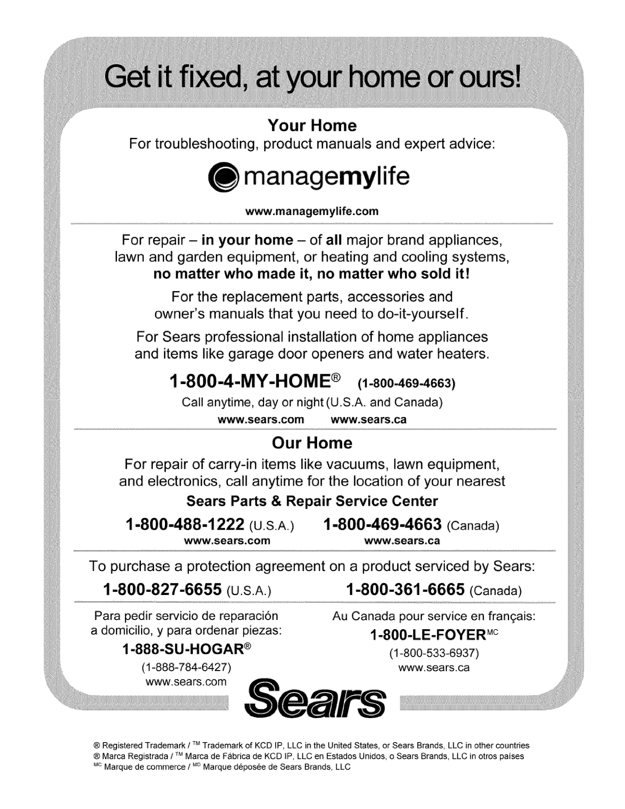 ® Registered Trademark /TM Trademark of KCD [P, LLC in the United States, or Sears Brands_ LLC in other countries