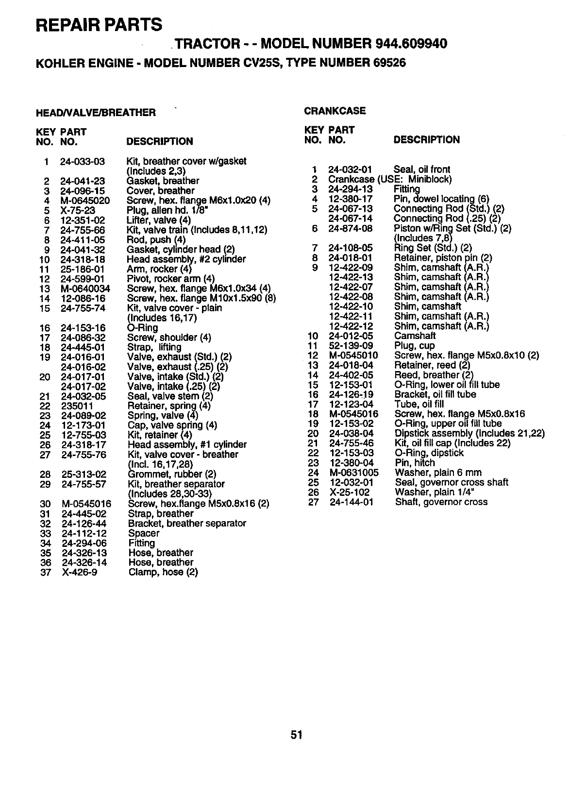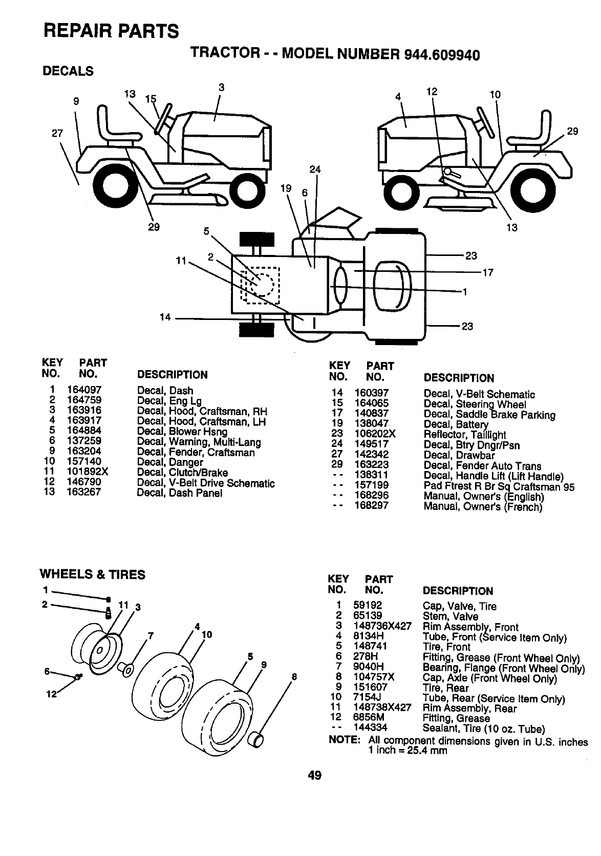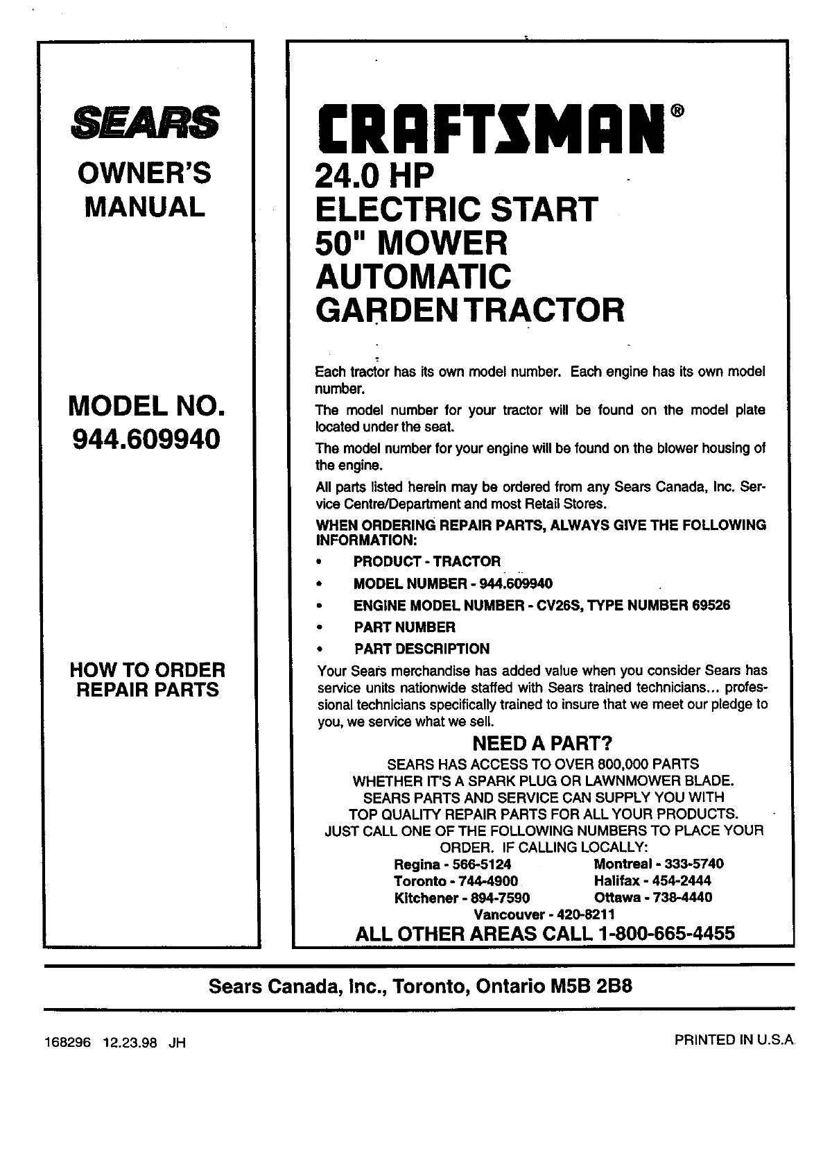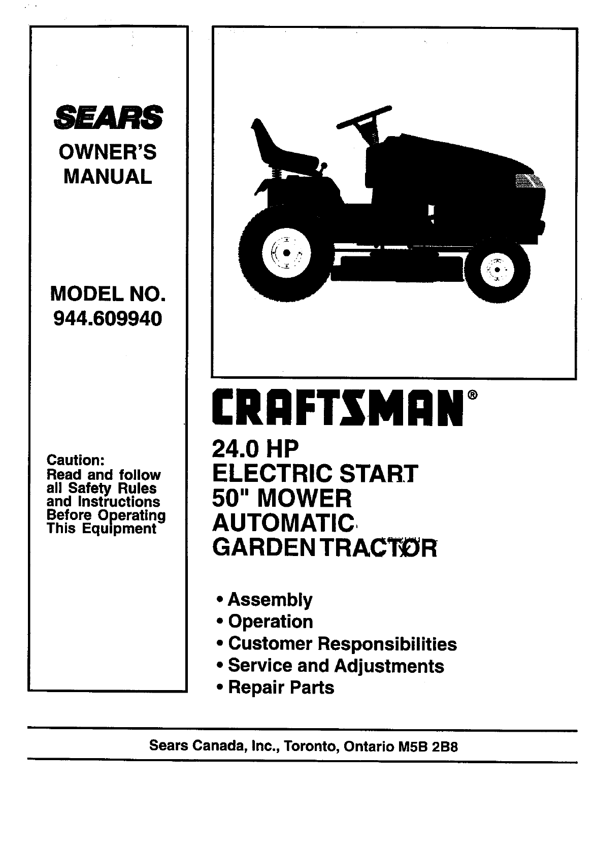 User Manual: Craftsman 944609940 944609940 CRAFTSMAN LAWN TRACTOR - Manuals and Guides View the owners manual for your CRAFTSMAN LAWN TRACTOR #944609940. Home:Lawn & Garden Parts:Craftsman Parts:Craftsman LAWN TRACTOR Manual
