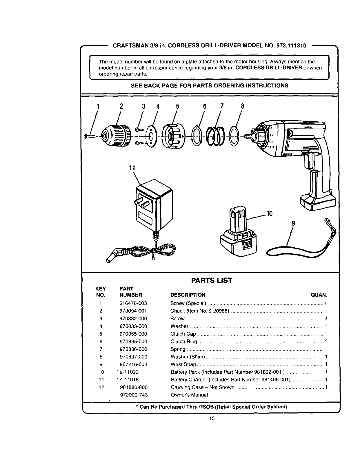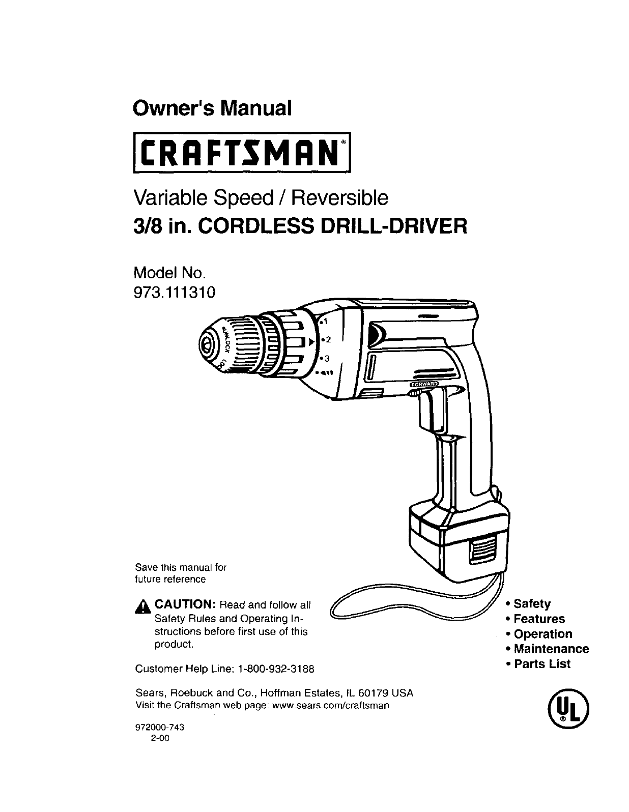 User Manual: Craftsman 973111310 973111310 CRAFTSMAN CORDLESS DRILL-DRIVER - Manuals and Guides View the owners manual for your CRAFTSMAN CORDLESS DRILL-DRIVER #973111310. Home:Tool Parts:Craftsman Parts:Craftsman CORDLESS DRILL-DRIVER Manual