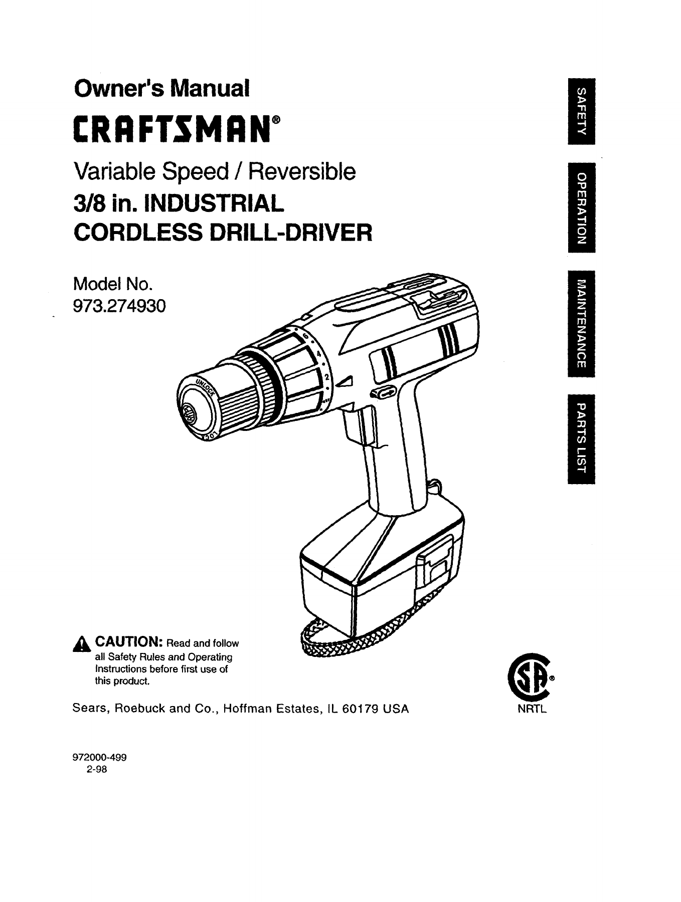 User Manual: Craftsman 973274930 973274930 CRAFTSMAN 3/8 CORDLESS DRILL DRIVER - Manuals and Guides View the owners manual for your CRAFTSMAN 3/8 CORDLESS DRILL DRIVER #973274930. Home:Tool Parts:Craftsman Parts:Craftsman 3/8 CORDLESS DRILL DRIVER Manual
