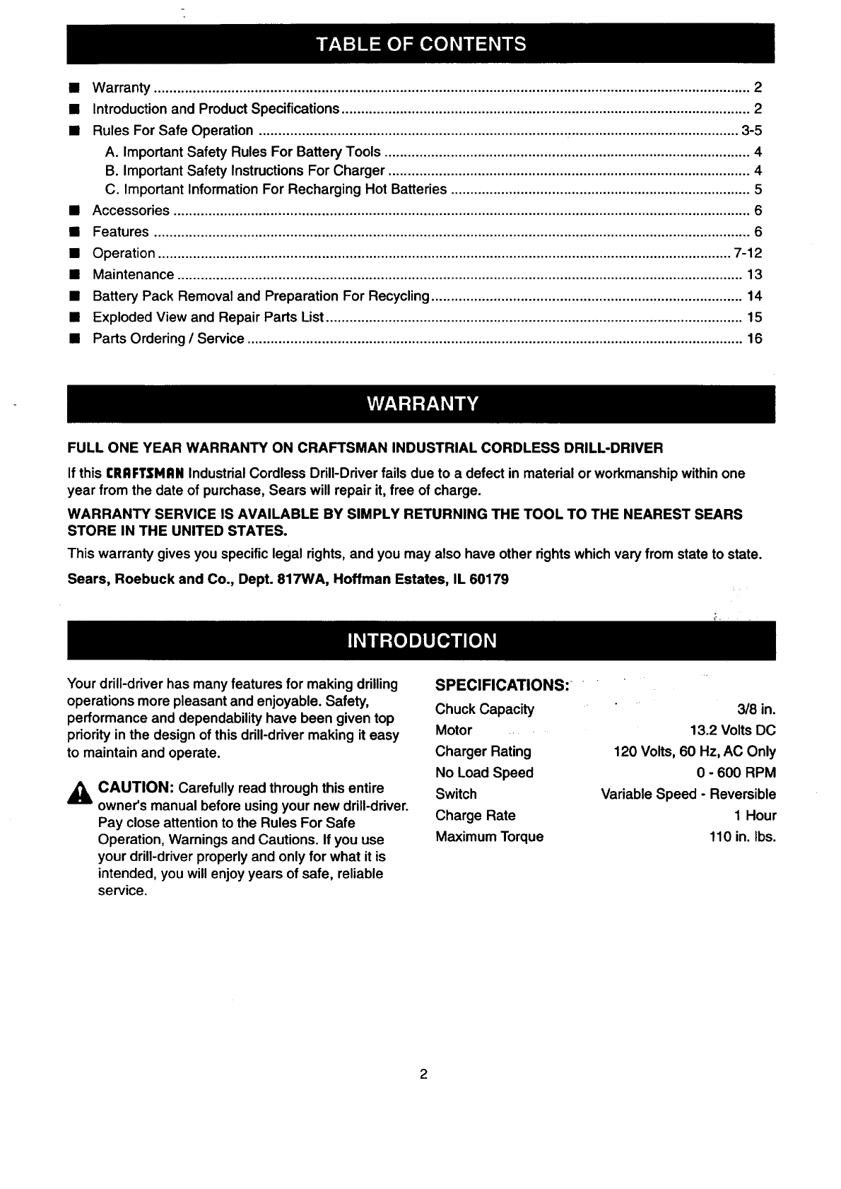 Craftsman 973274930 User Manual 3/8 CORDLESS DRILL DRIVER Manuals And Guides 98100017