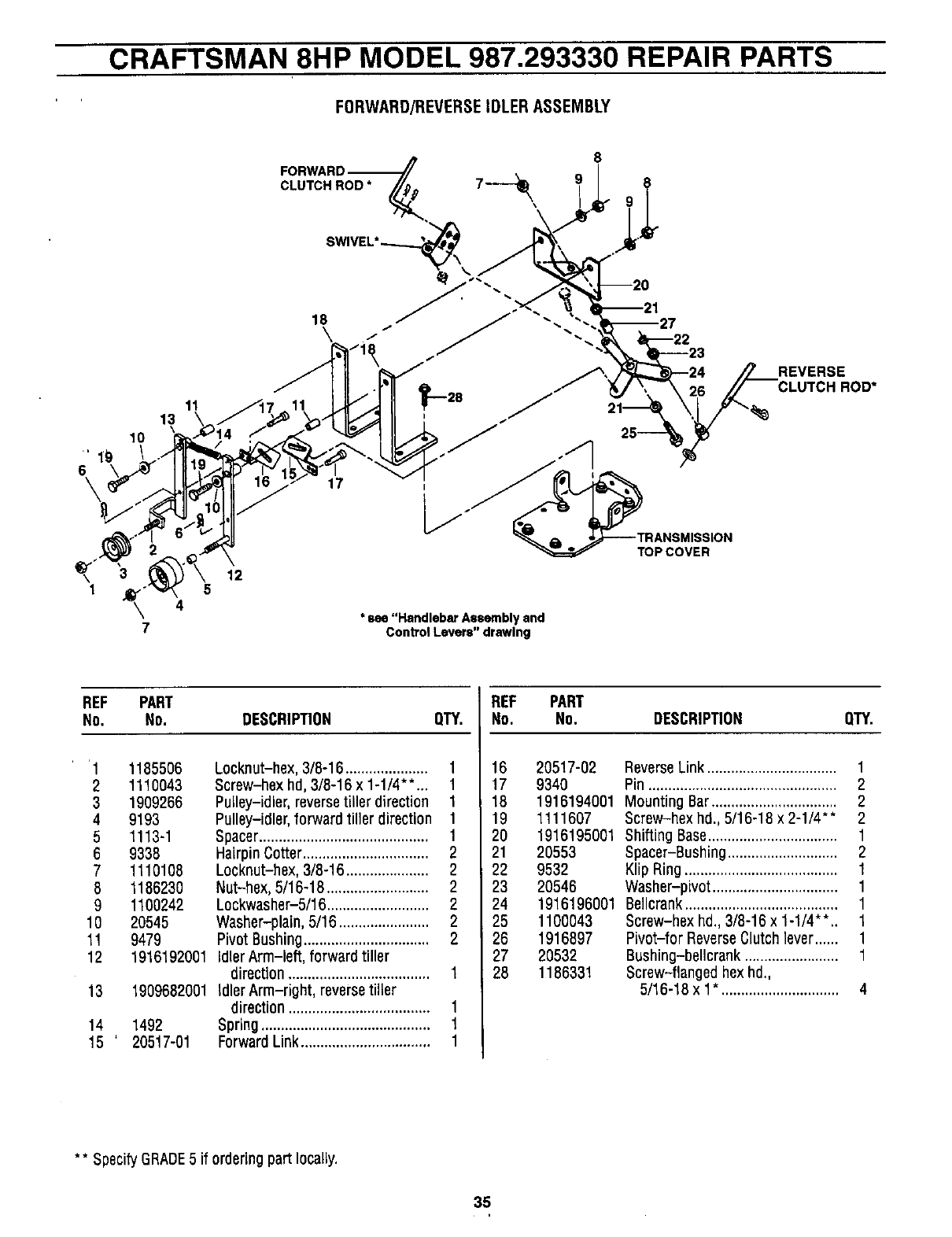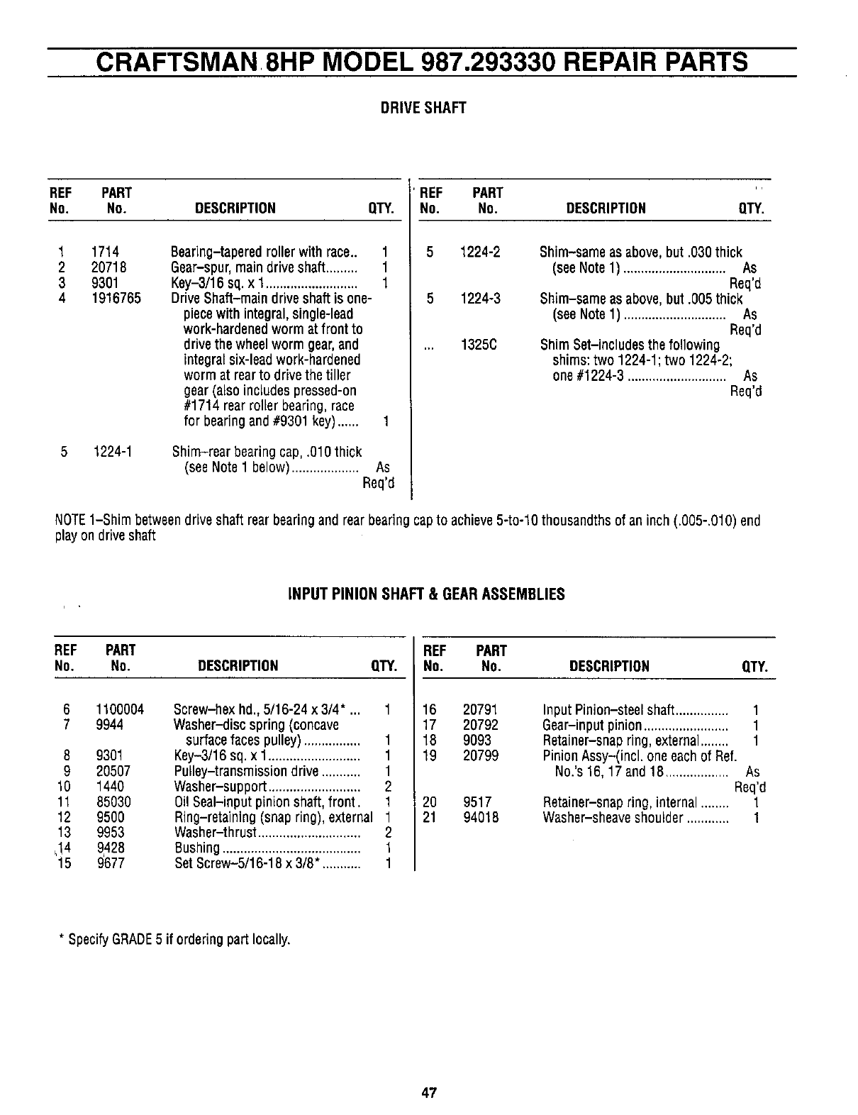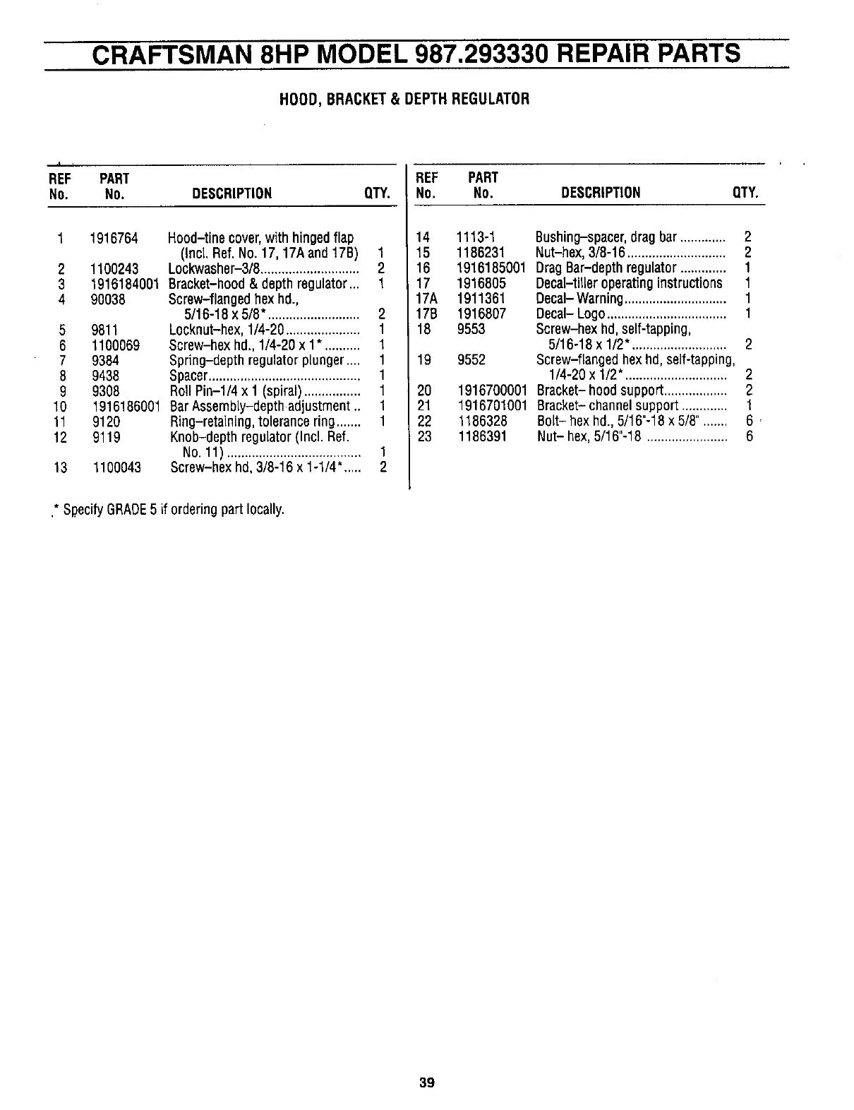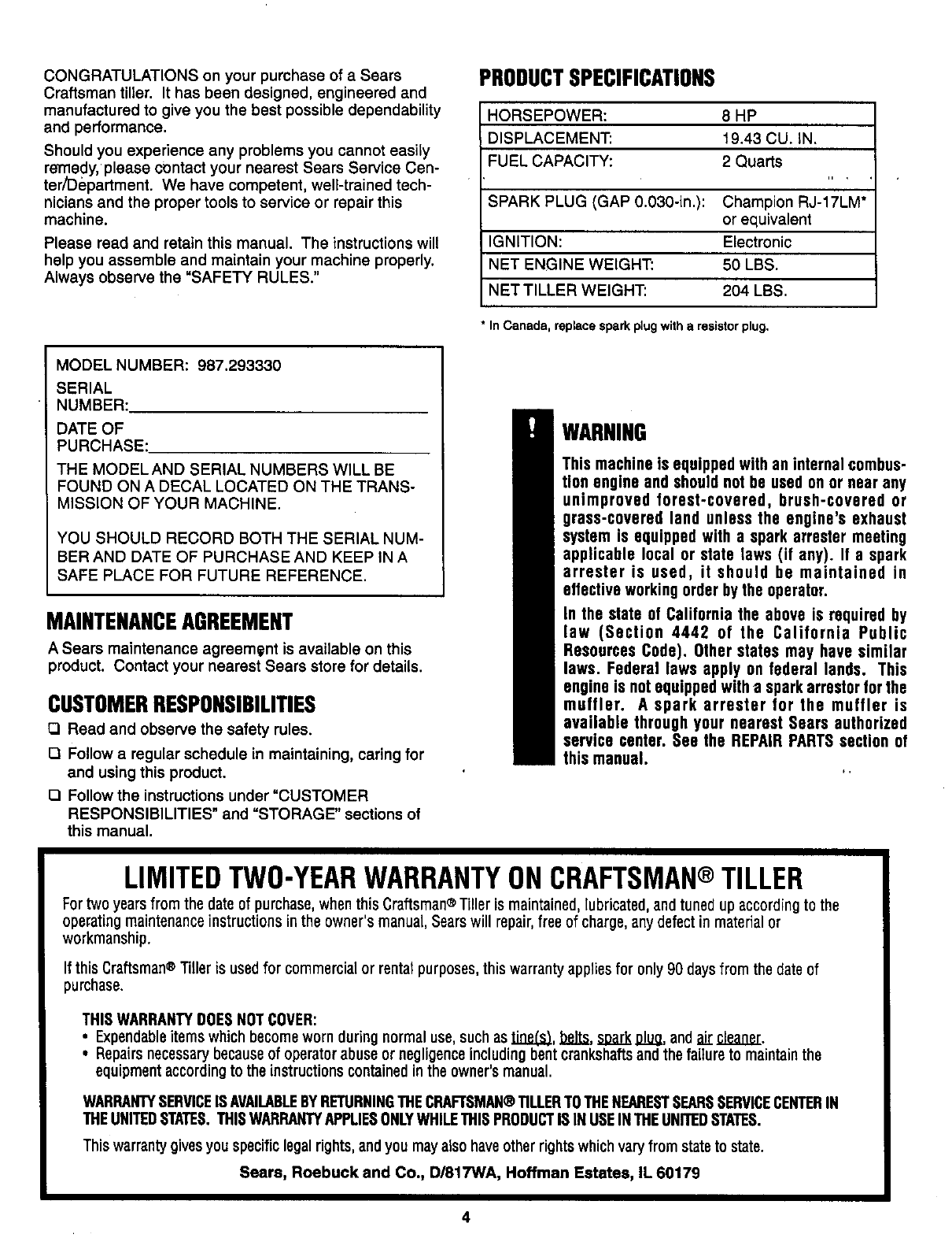 User Manual: Craftsman 987293330 987293330 CRAFTSMAN 8 HORSEPOWER REAR TINE TILLER - Manuals and Guides View the owners manual for your CRAFTSMAN 8 HORSEPOWER REAR TINE TILLER #987293330. Home:Lawn & Garden Parts:Craftsman Parts:Craftsman 8 HORSEPOWER REAR TINE TILLER Manual