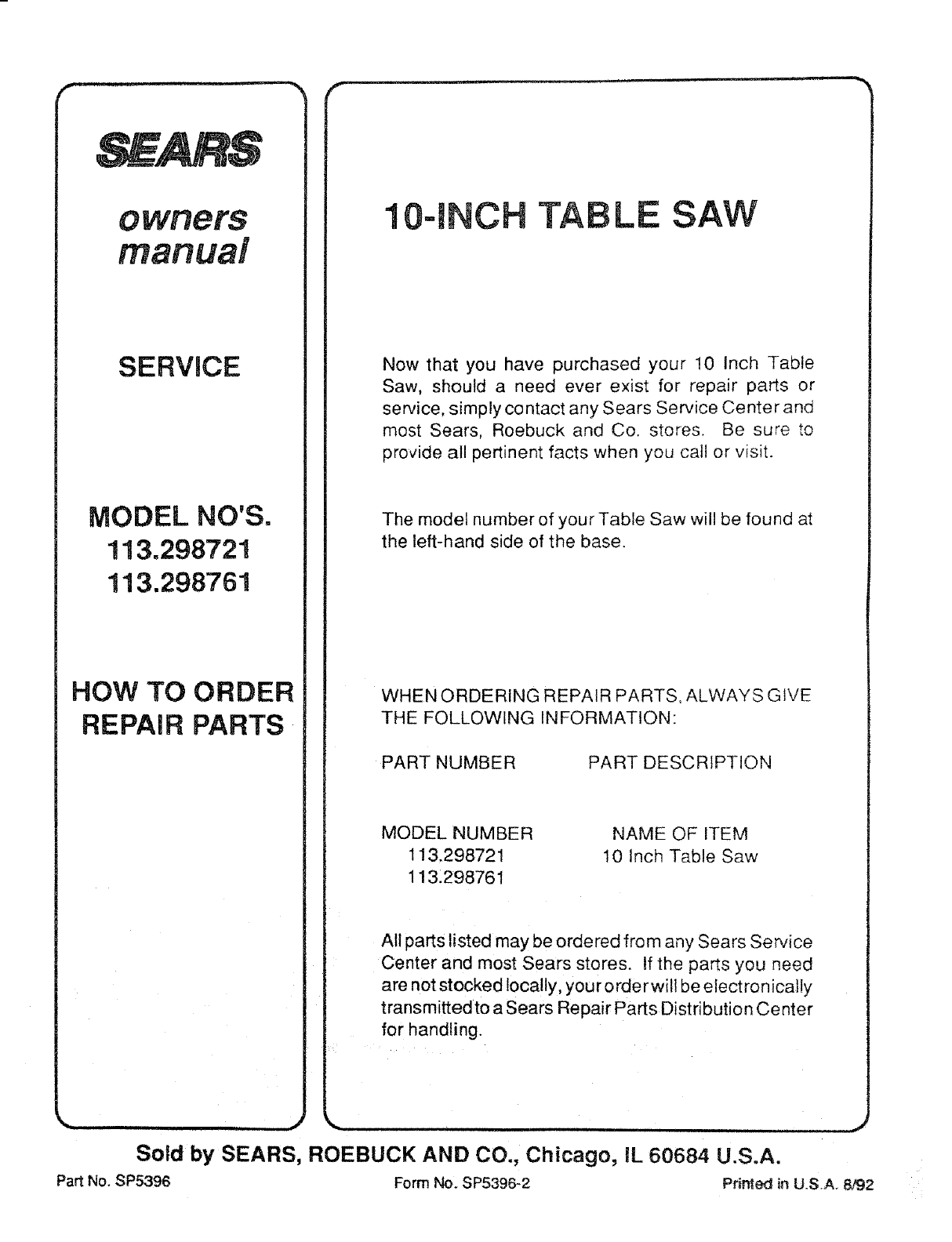 Part No. SP5396 Form No. SP5396-2 Printed in U.S.A. 8/92