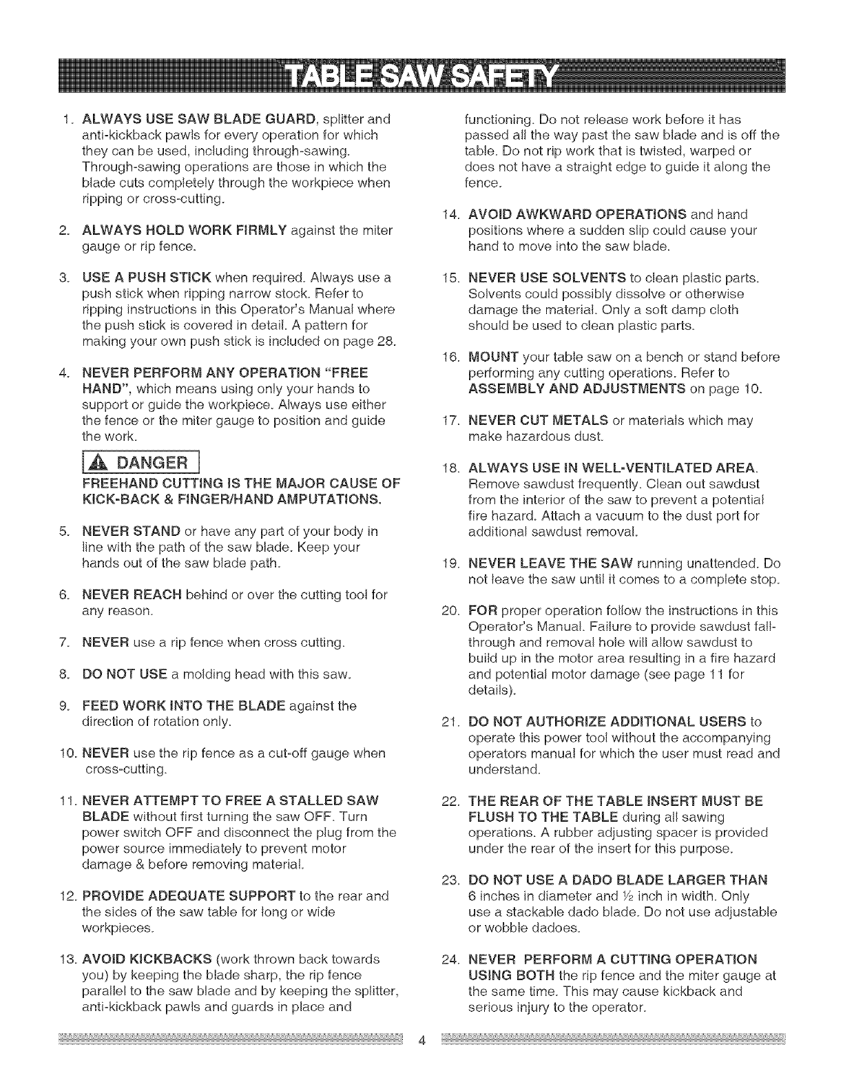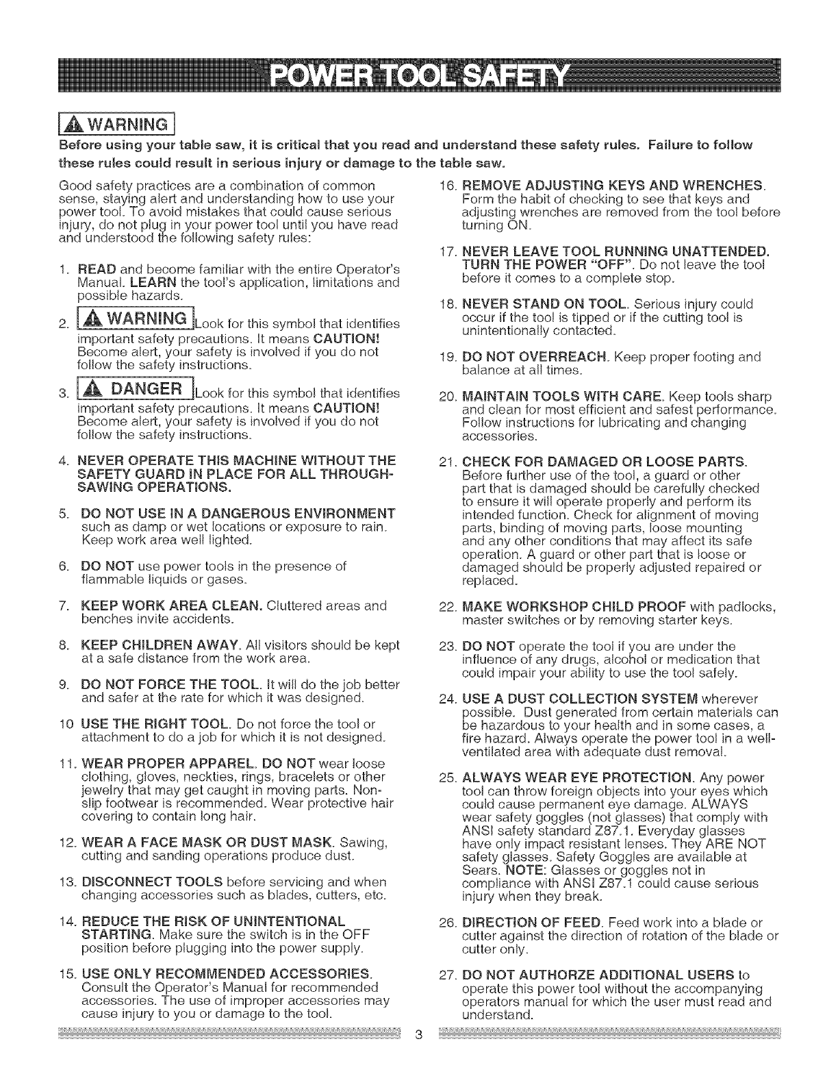 Before using your tabJe saw, it is critical that you read and understand these safety rules. Failure to follow