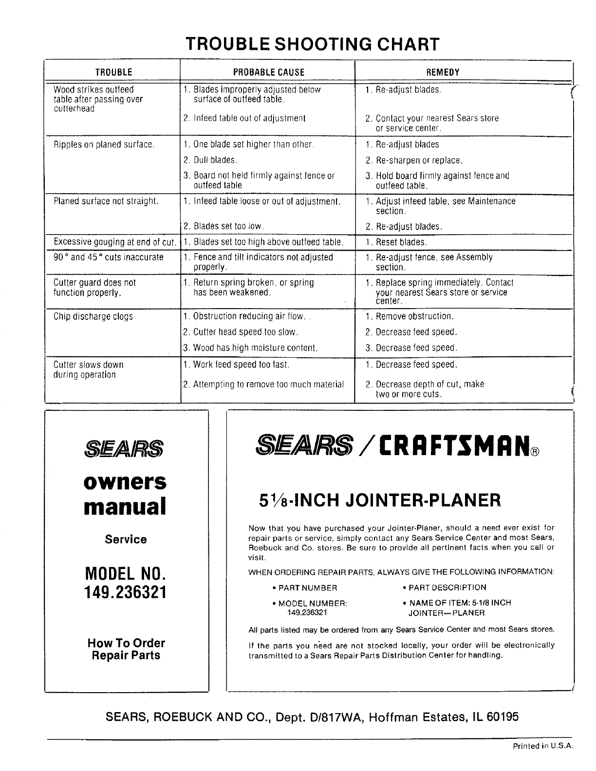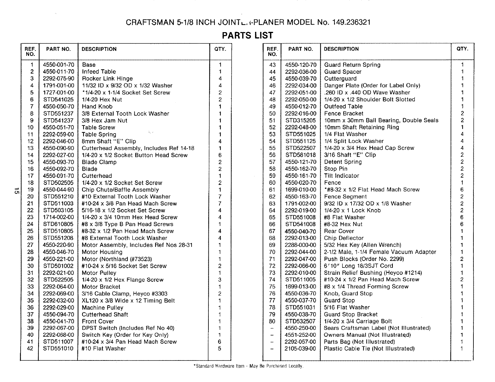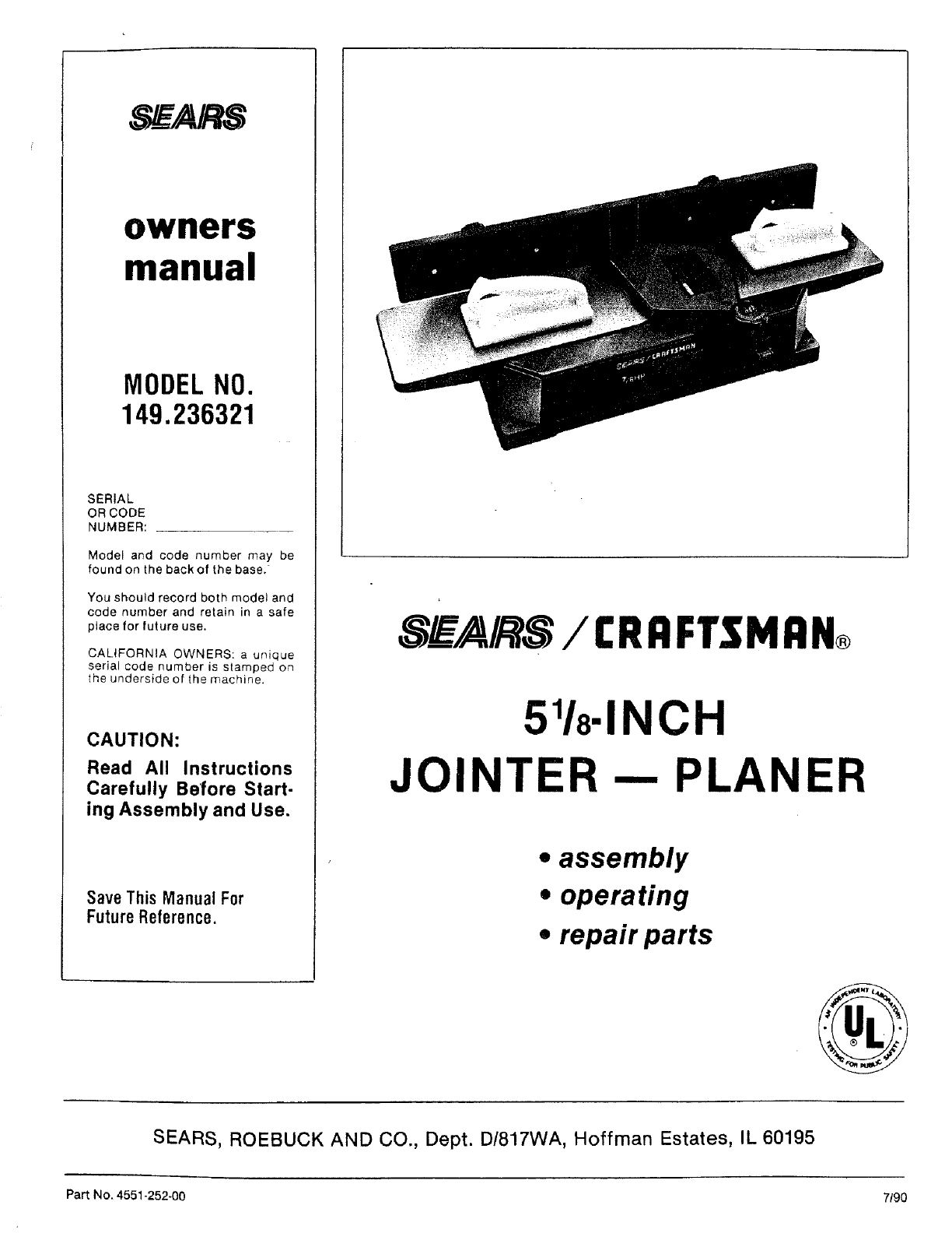 149236321 149236321 CRAFTSMAN JOINTER - PLANER - Manuals and Guides L0806251 View the owners manual for your CRAFTSMAN JOINTER - PLANER #149236321. Home:Tool Parts:Craftsman Parts:Craftsman JOINTER - PLANER Manual