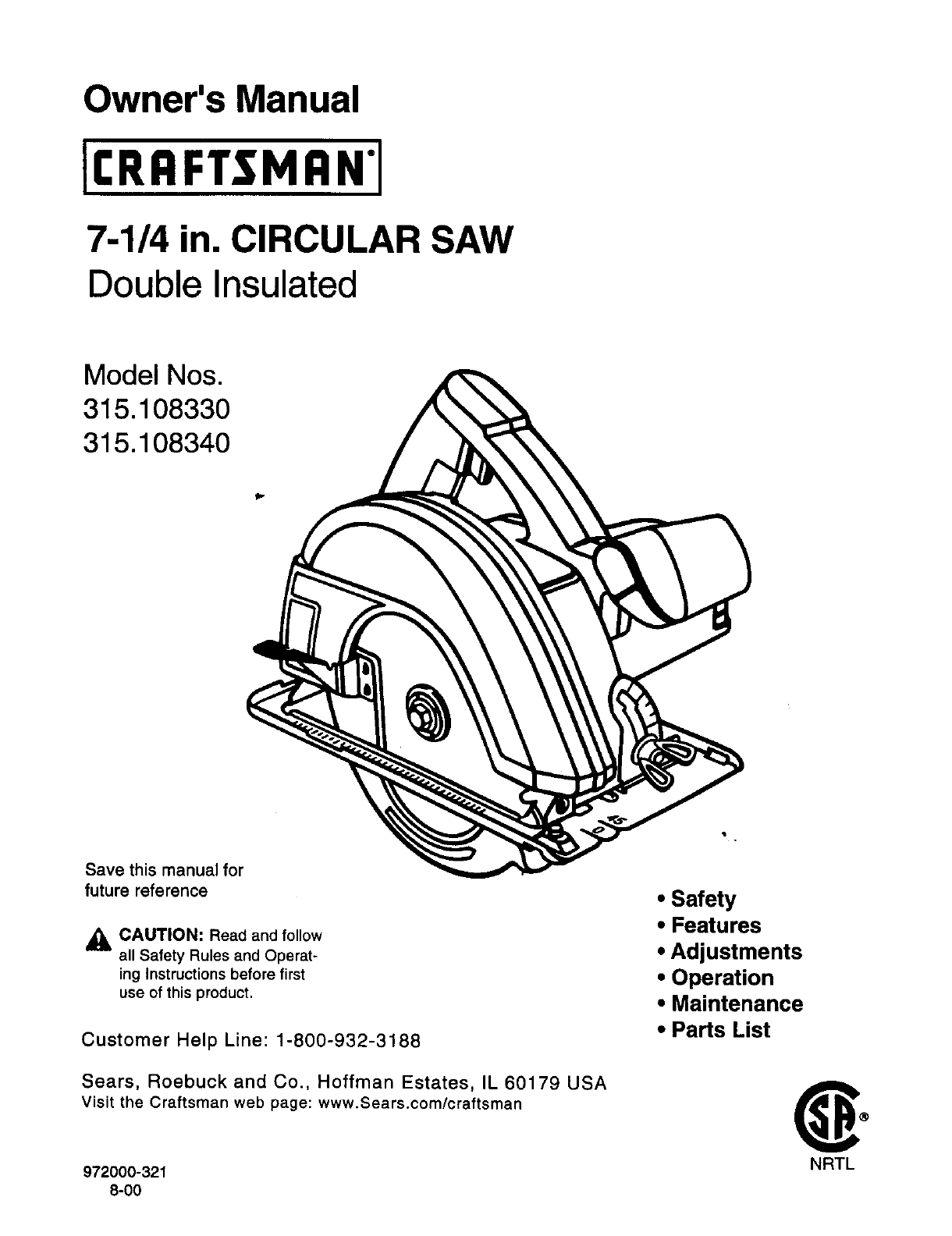 315108330 315108330 CRAFTSMAN CIRCULAR SAW - Manuals and Guides L0090007 View the owners manual for your CRAFTSMAN CIRCULAR SAW #315108330. Home:Tool Parts:Craftsman Parts:Craftsman CIRCULAR SAW Manual