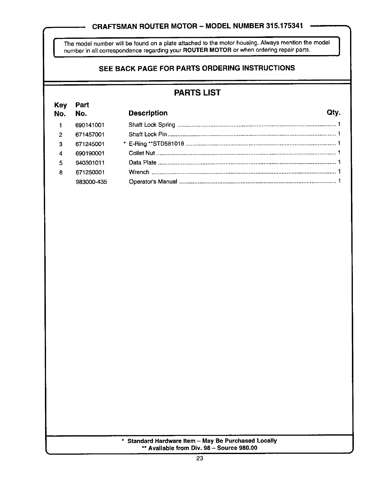 315175341 315175341 CRAFTSMAN ROUTER MOTOR - Manuals and Guides L0502186 View the owners manual for your CRAFTSMAN ROUTER MOTOR #315175341. Home:Tool Parts:Craftsman Parts:Craftsman ROUTER MOTOR Manual