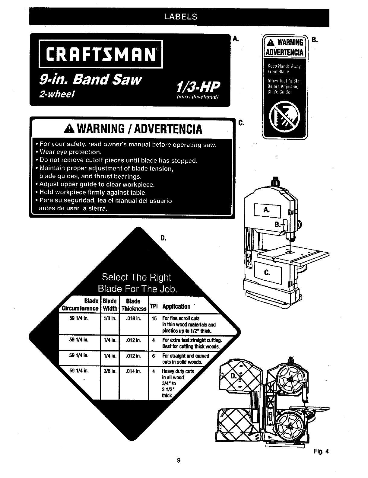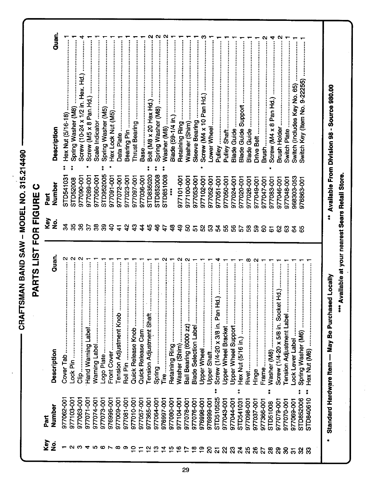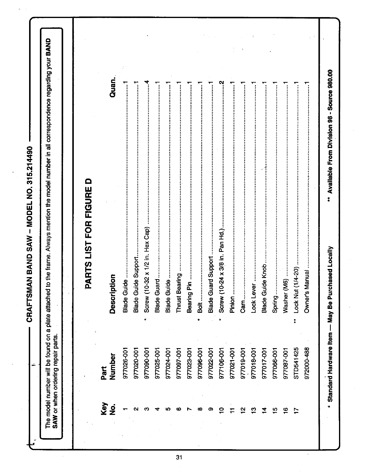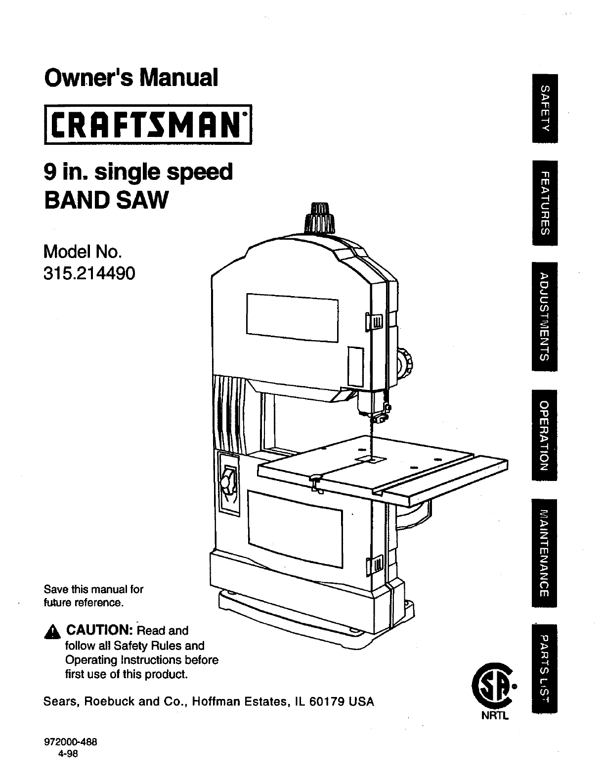 315214490 315214490 CRAFTSMAN 9 in. SINGLE SPEED BAND SAW - Manuals and Guides 98100165 View the owners manual for your CRAFTSMAN 9 in. SINGLE SPEED BAND SAW #315214490. Home:Tool Parts:Craftsman Parts:Craftsman 9 in. SINGLE SPEED BAND SAW Manual