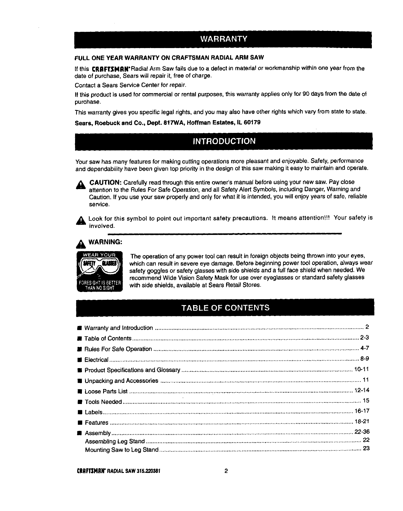 FULL ONE YEAR WARRANTY ON CRAFTSMAN RADIAL ARM SAW