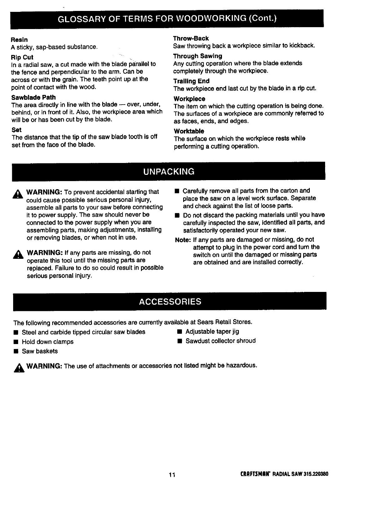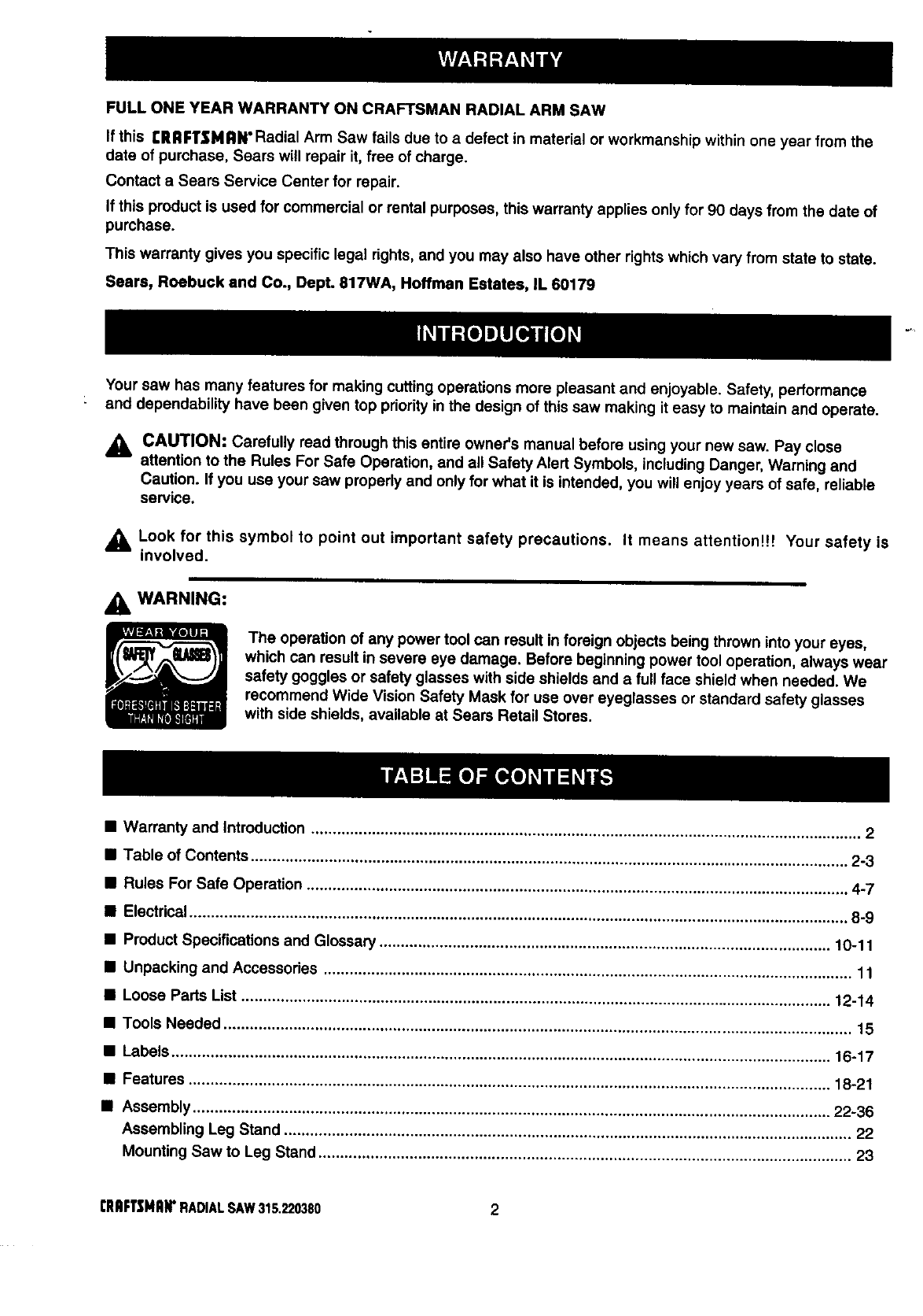 FULL ONE YEAR WARRANTY ON CRAFTSMAN RADIAL ARM SAW