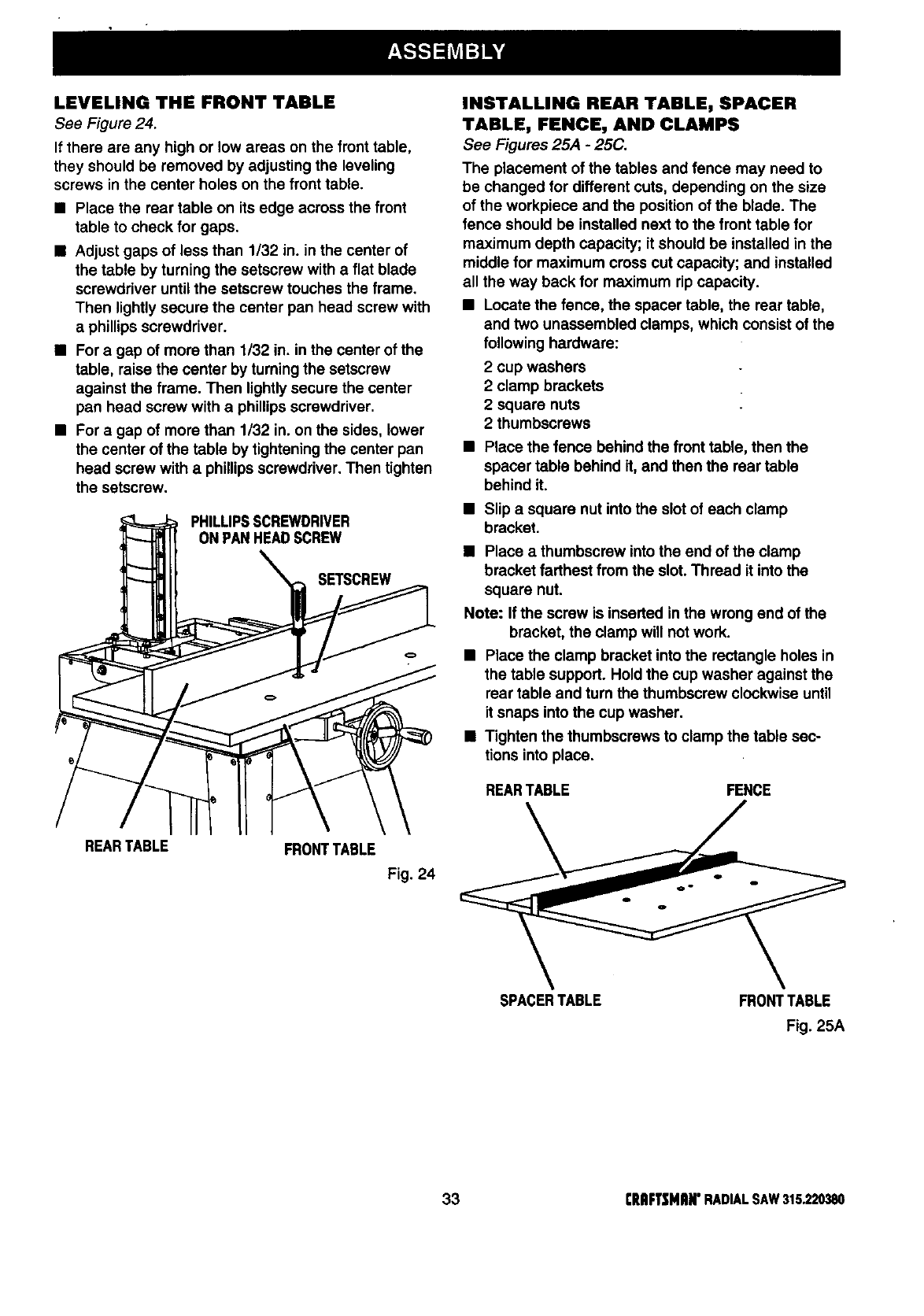Installing Rear Table, Spacer Table, Fence, and Clamps ............... .:........................................................ 33-34