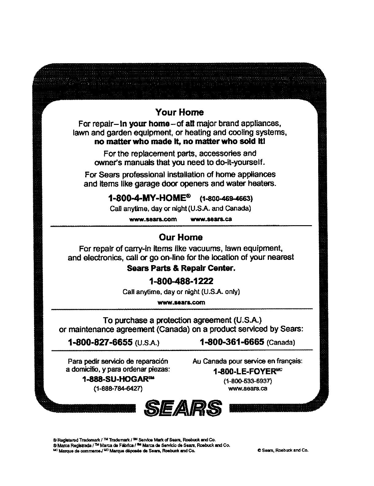 Sears Repair Center. Contact your nearest Sears Reran Store for Service Center Inform'don.