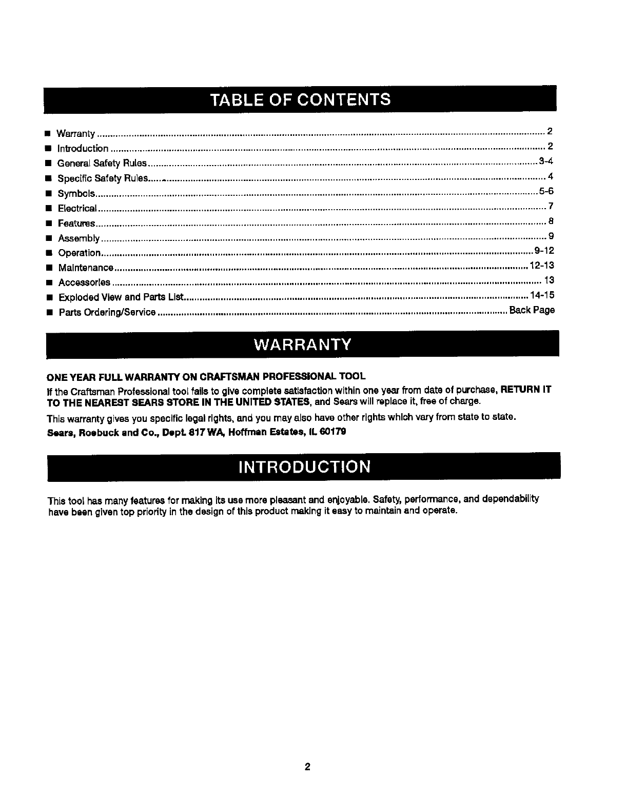If the Craftsman Professionaltool fails to give completesatisfactionwithinone year from date o1purchase, RETURN IT