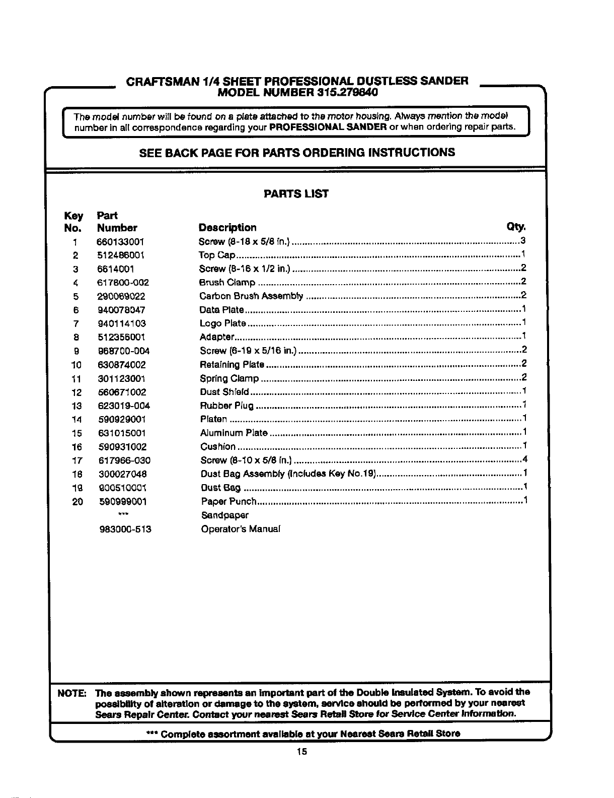 315279840 315279840 CRAFTSMAN SANDER - Manuals and Guides L0502187 View the owners manual for your CRAFTSMAN SANDER #315279840. Home:Tool Parts:Craftsman Parts:Craftsman SANDER Manual