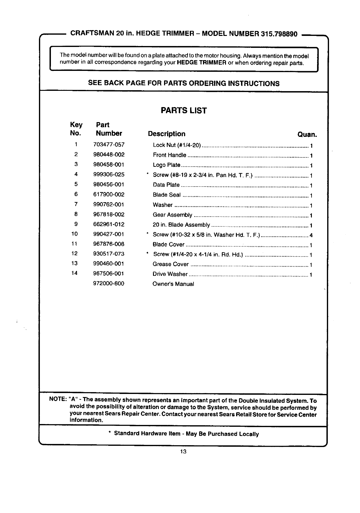 SEE BACK PAGE FOR PARTS ORDERING INSTRUCTIONS