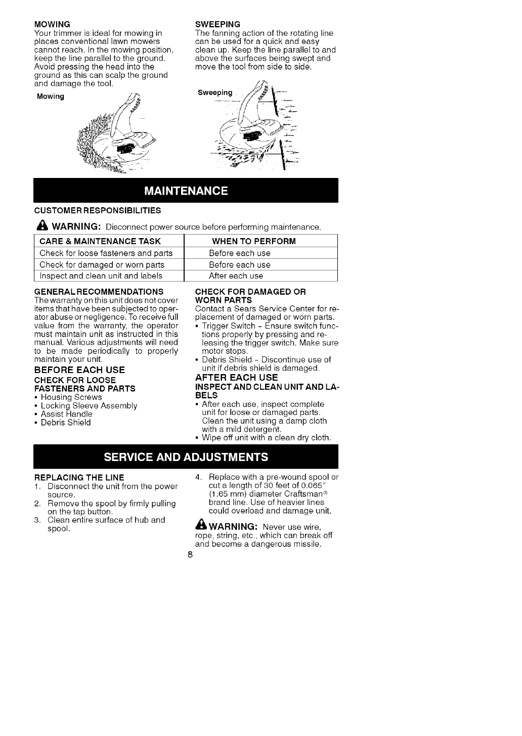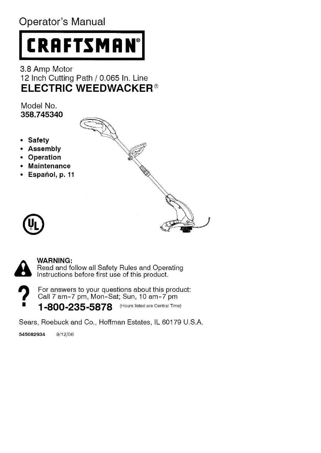 358745340 358745340 CRAFTSMAN ELECTRIC LINE TRIMMER - Manuals and Guides L0609431 View the owners manual for your CRAFTSMAN ELECTRIC LINE TRIMMER #358745340. Home:Lawn & Garden Parts:Craftsman Parts:358745340 Craftsman Grass trimmer (weed wacker) Manual