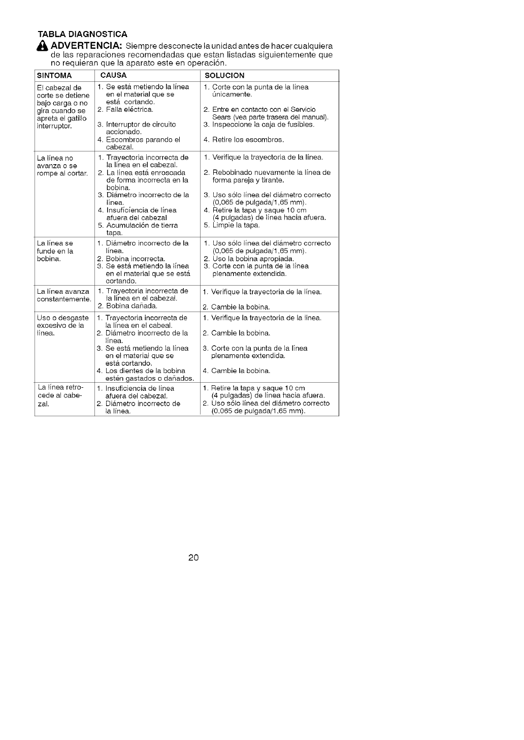 La lieea se 1. Use solo lieea dei diAmetro correcto