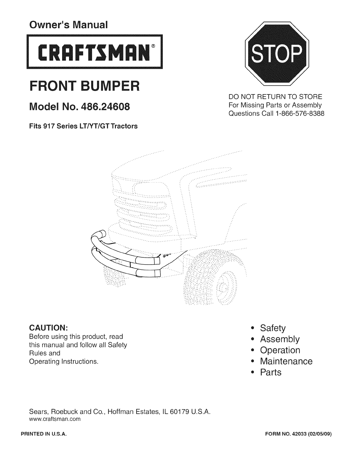 48624608 48624608 CRAFTSMAN FRONT BUMPER - Manuals and Guides L0904375 View the owners manual for your CRAFTSMAN FRONT BUMPER #48624608. Home:Lawn & Garden Parts:Craftsman Parts:Craftsman FRONT BUMPER Manual