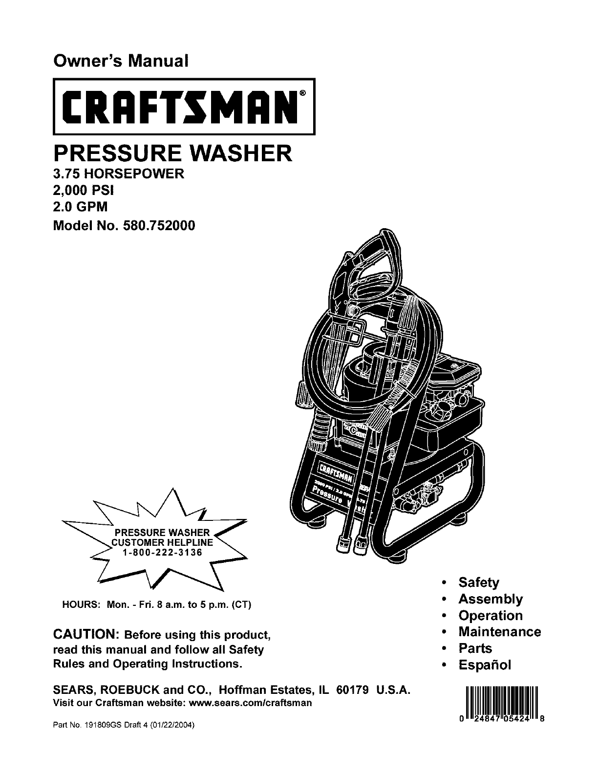 580752000 580752000 CRAFTSMAN PRESSURE WASHER - Manuals and Guides L0401298 View the owners manual for your CRAFTSMAN PRESSURE WASHER #580752000. Home:Lawn & Garden Parts:Craftsman Parts:Craftsman PRESSURE WASHER Manual