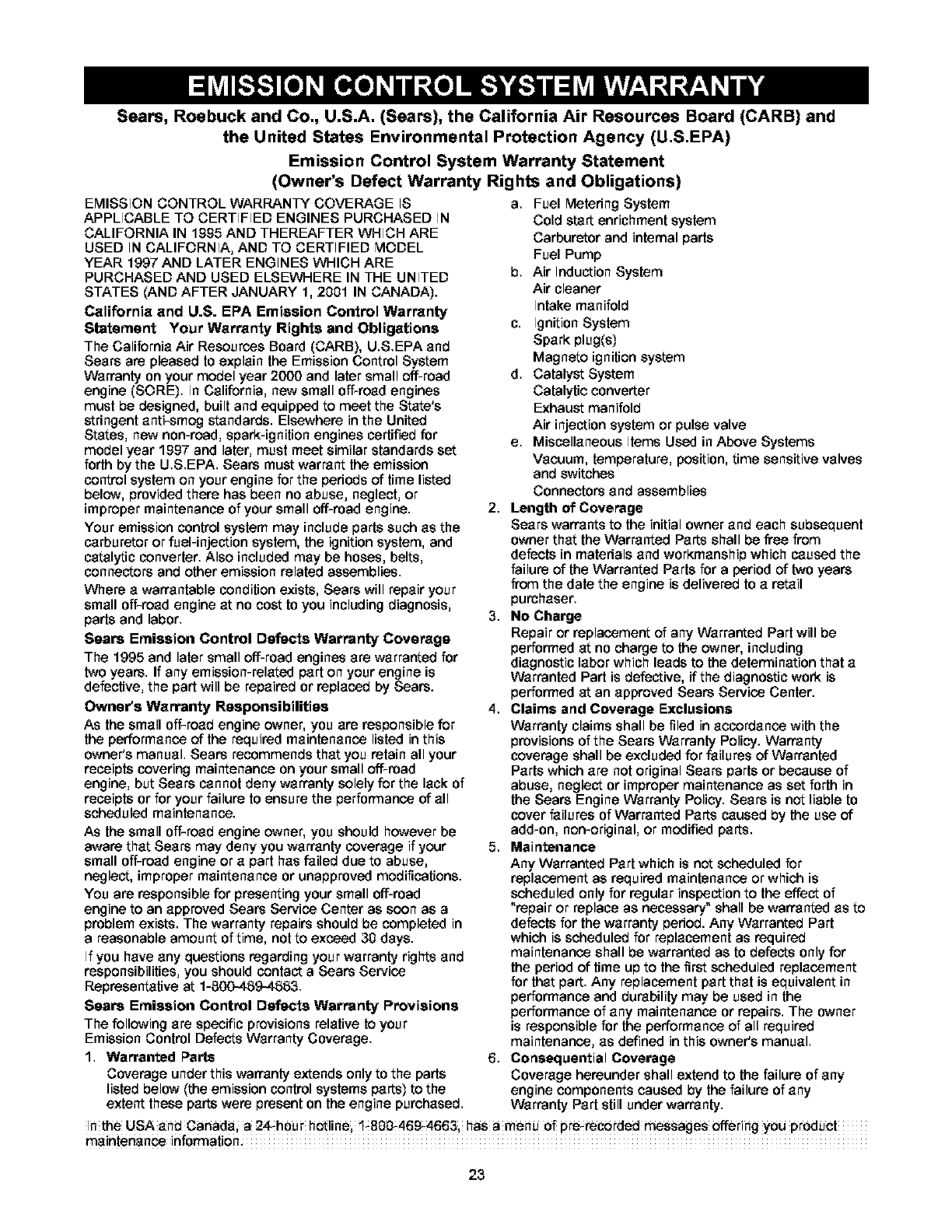 according to the instructions in the owner's manual, Sears will repair, free of charge, any defect in material and