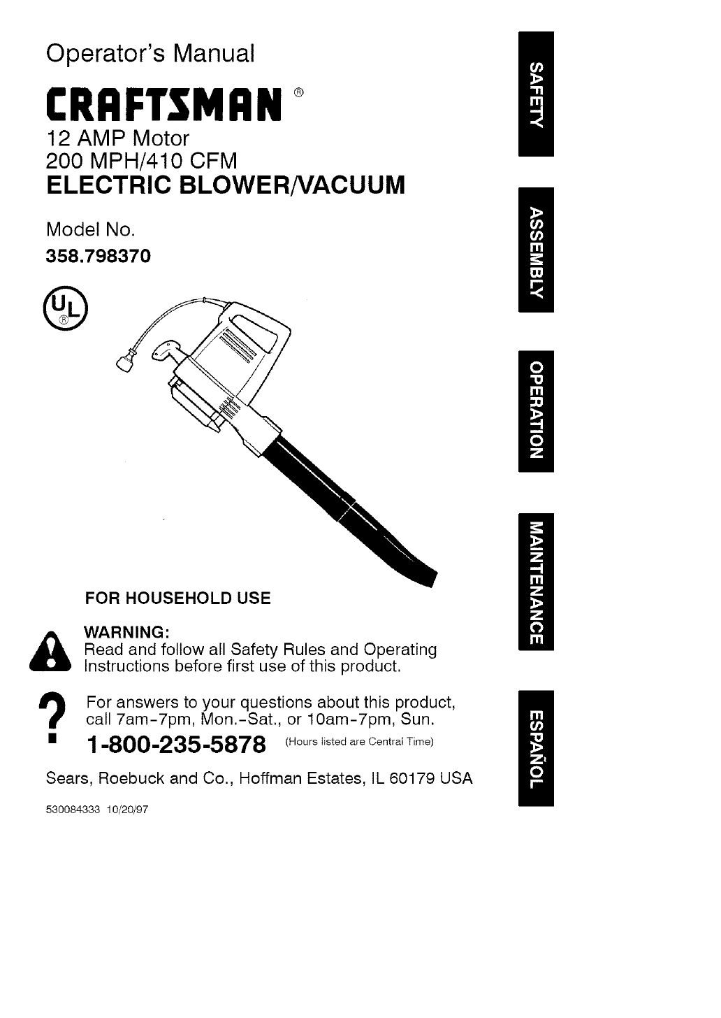358798370 358798370 CRAFTSMAN BLOWER - Manuals and Guides L0711334 View the owners manual for your CRAFTSMAN BLOWER #358798370. Home:Lawn & Garden Parts:Craftsman Parts:Craftsman BLOWER Manual