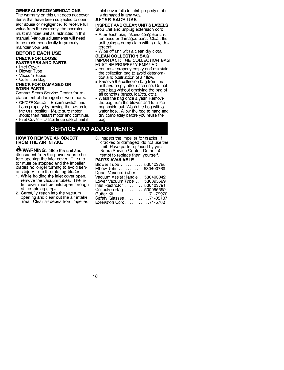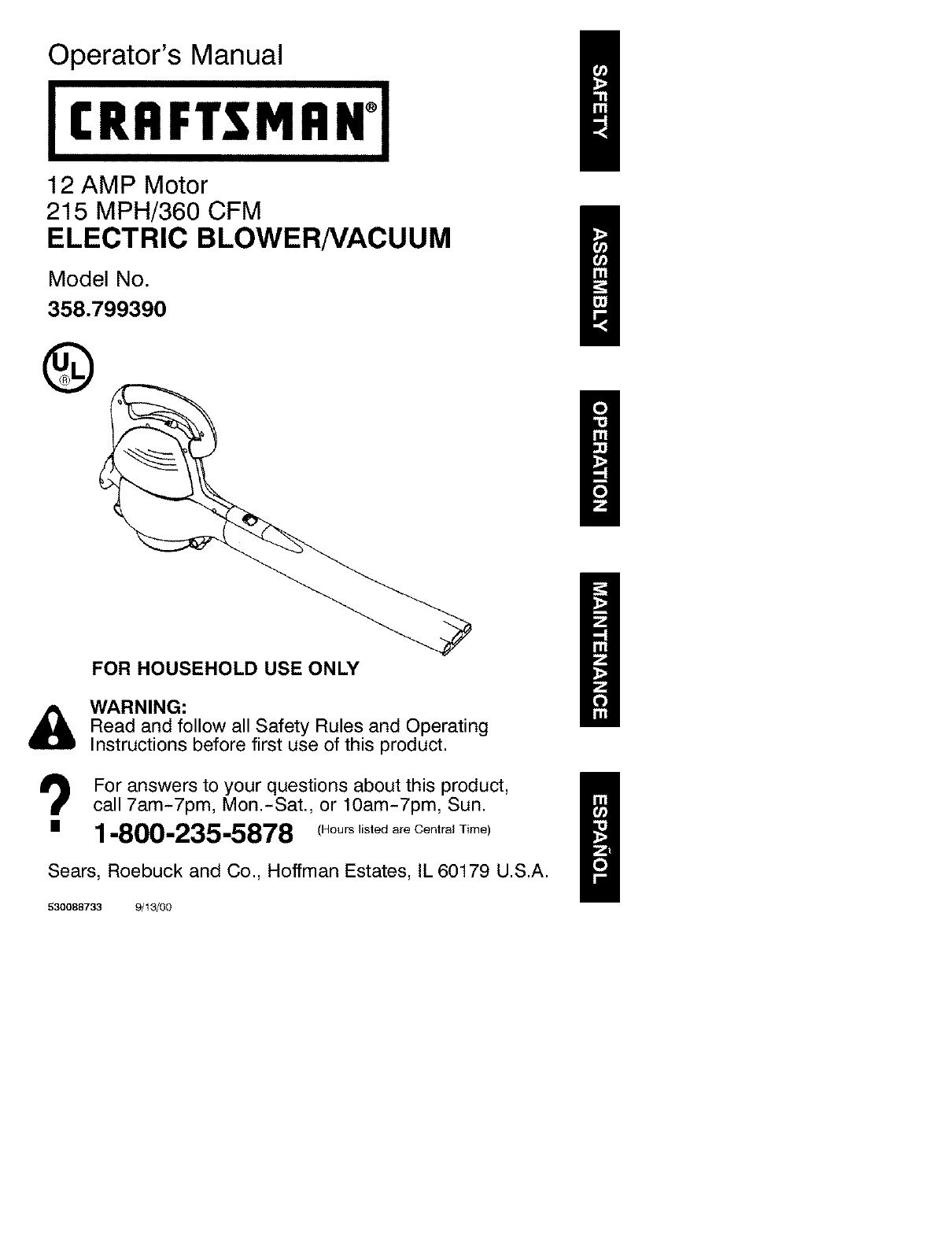 358799390 358799390 CRAFTSMAN ELECTRIC BLOWER - Manuals and Guides L0212109 View the owners manual for your CRAFTSMAN ELECTRIC BLOWER #358799390. Home:Lawn & Garden Parts:Craftsman Parts:Craftsman ELECTRIC BLOWER Manual