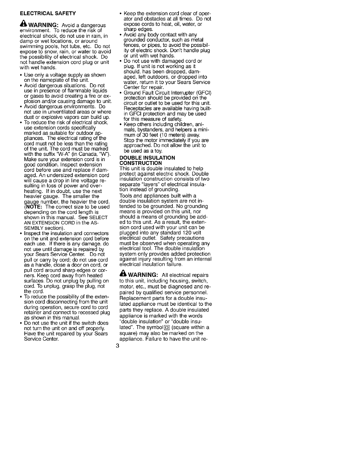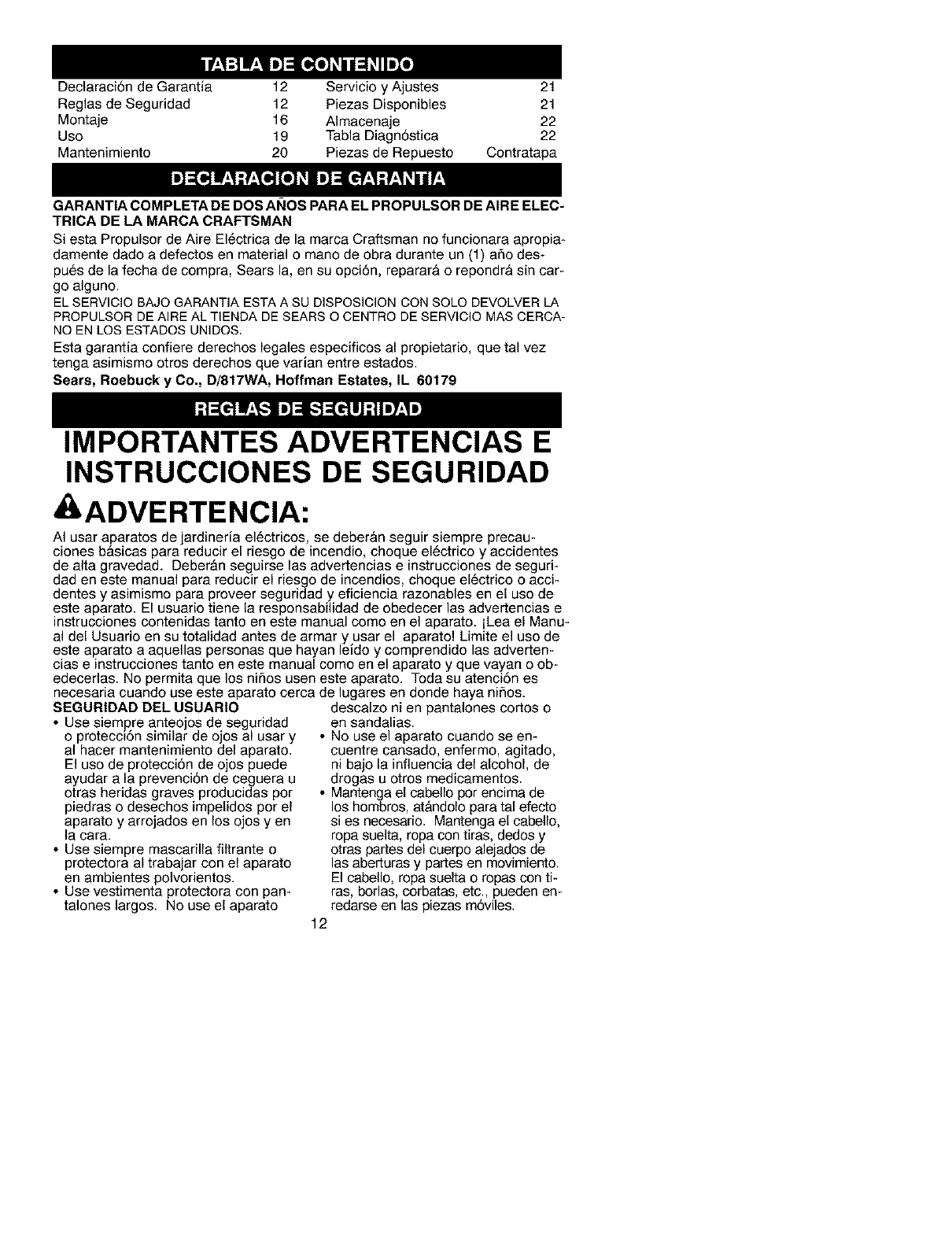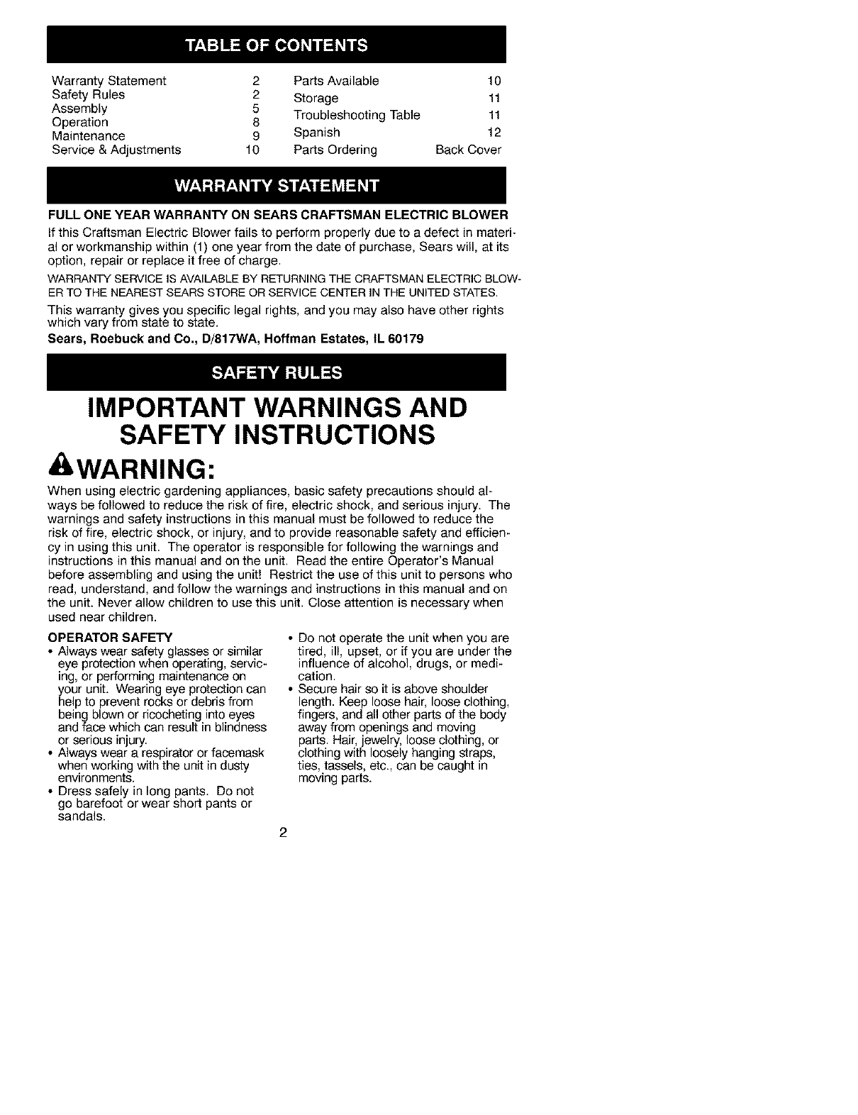 WARRANTY SERVICE IS AVAILABLE BY RETURNINGTHE CRAFTSMANELECTRIC BLOW-