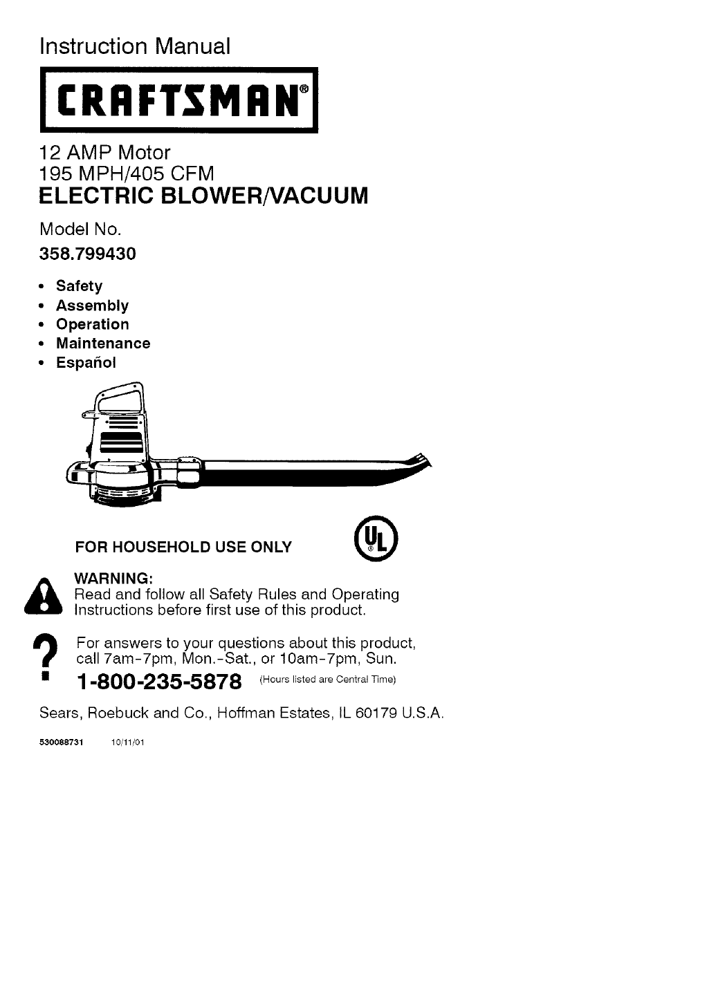 358799430 358799430 CRAFTSMAN ELECTRIC BLOWER - Manuals and Guides L0412239 View the owners manual for your CRAFTSMAN ELECTRIC BLOWER #358799430. Home:Lawn & Garden Parts:Craftsman Parts:Craftsman ELECTRIC BLOWER Manual