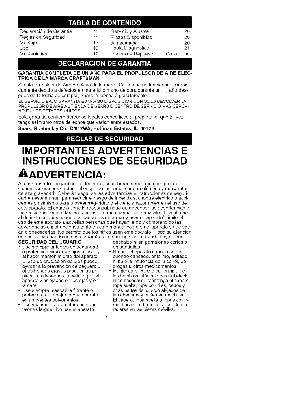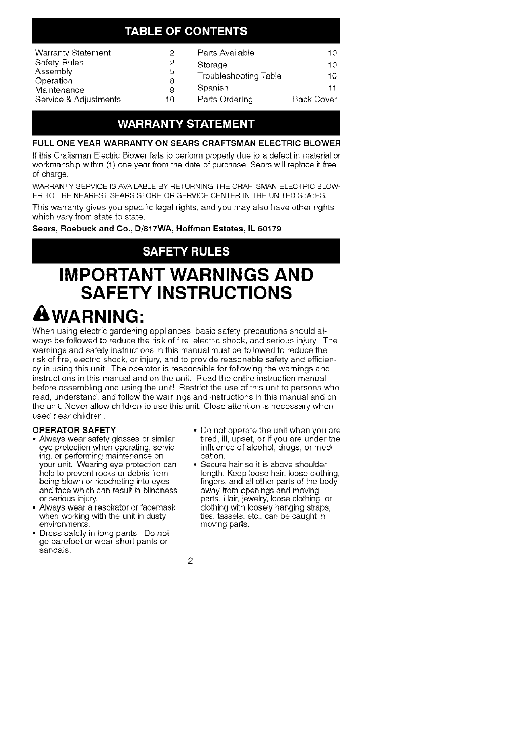 WARRANTY SERVICE IS AVAILABLE BY RETURNING THE CRAFTSMAN ELECTRIC BLOW-