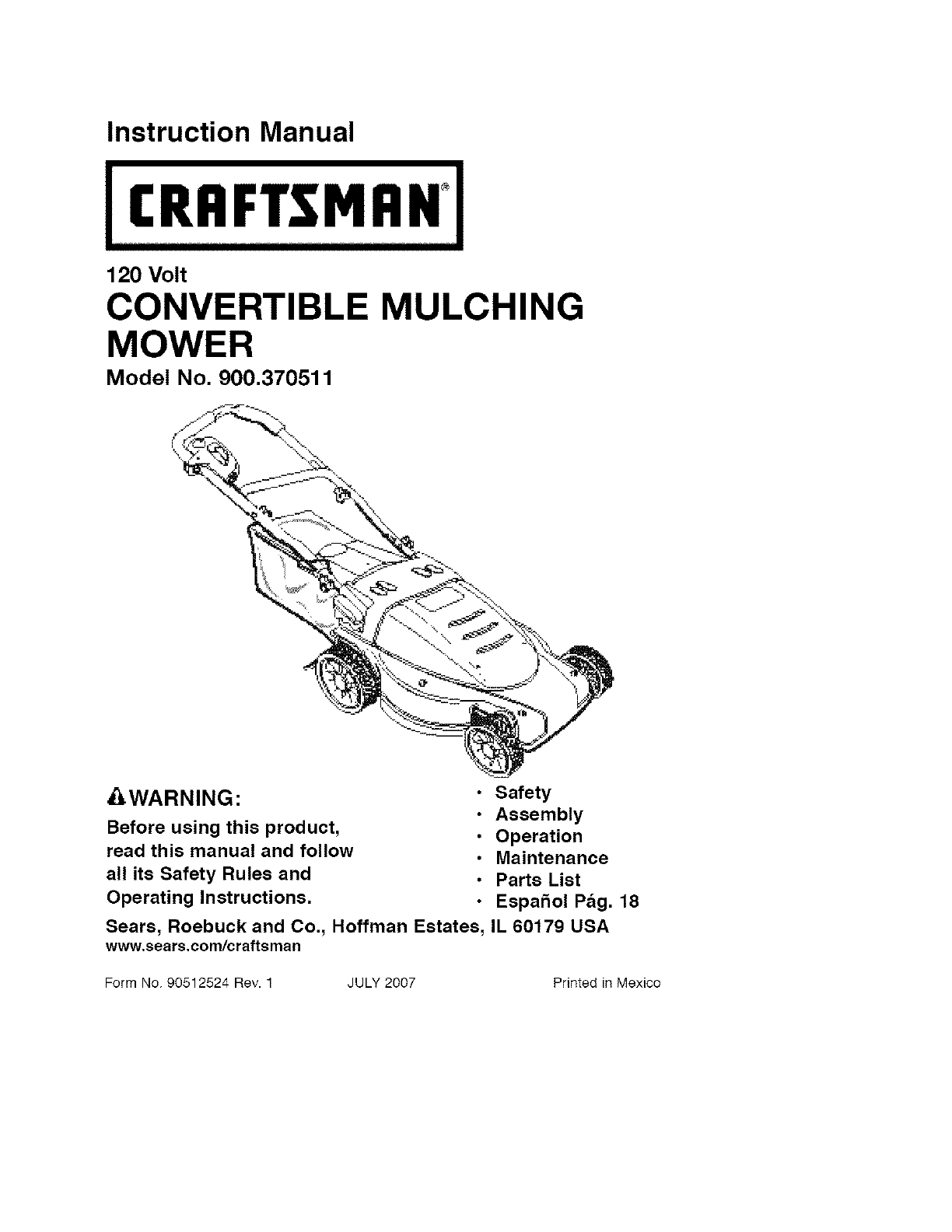 900370511 900370511 CRAFTSMAN MULCHING MOWER - Manuals and Guides L0808079 View the owners manual for your CRAFTSMAN MULCHING MOWER #900370511. Home:Lawn & Garden Parts:Craftsman Parts:Craftsman MULCHING MOWER Manual