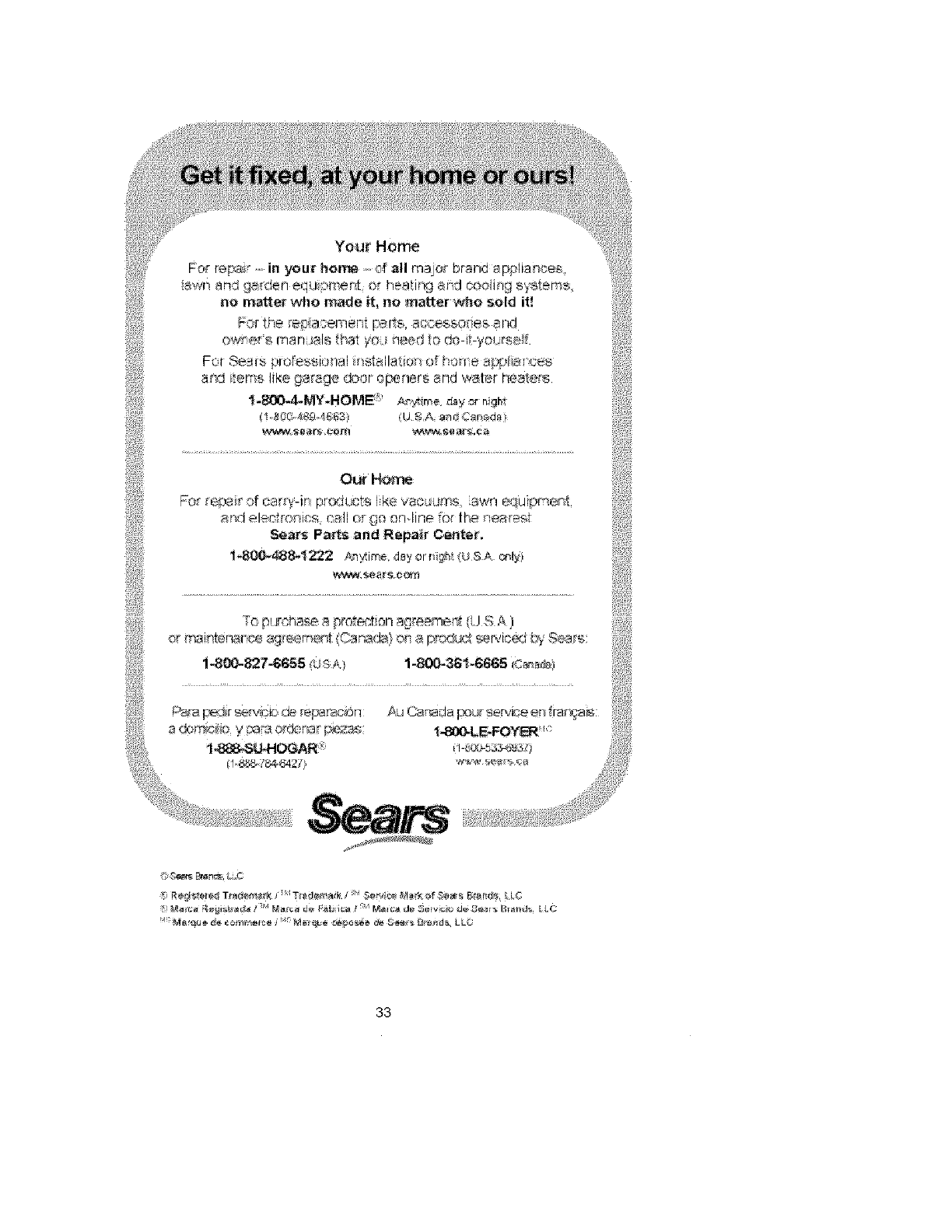 owner'smanual,Searswillrepairanydefectinmateria!orworkmanshipfreeofcharge.