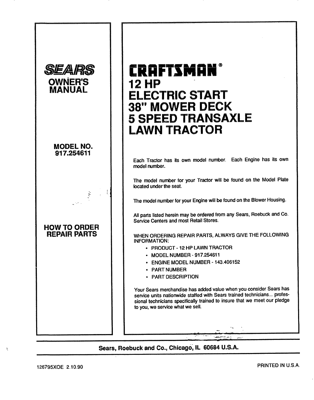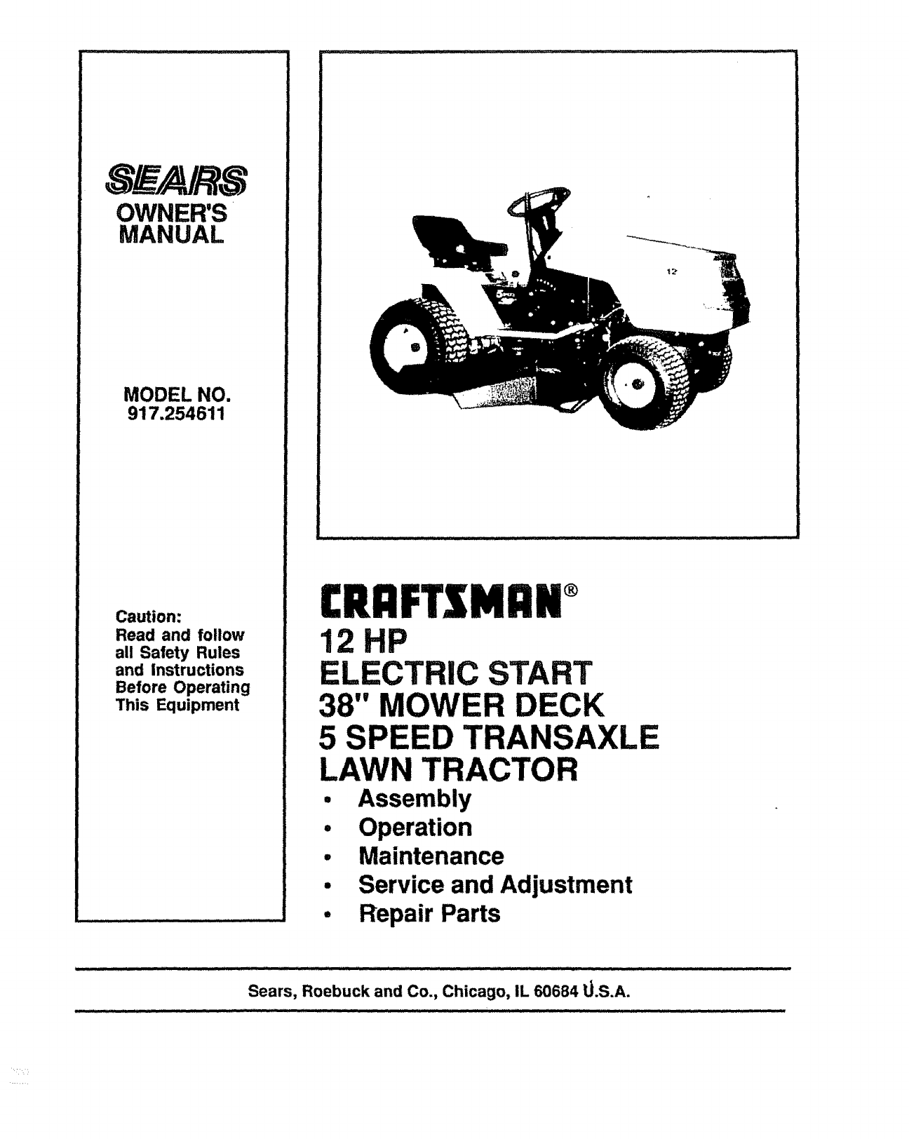 917254611 917254611 CRAFTSMAN TRACTOR - Manuals and Guides L0909634 View the owners manual for your CRAFTSMAN TRACTOR #917254611. Home:Lawn & Garden Parts:Craftsman Parts:Craftsman TRACTOR Manual