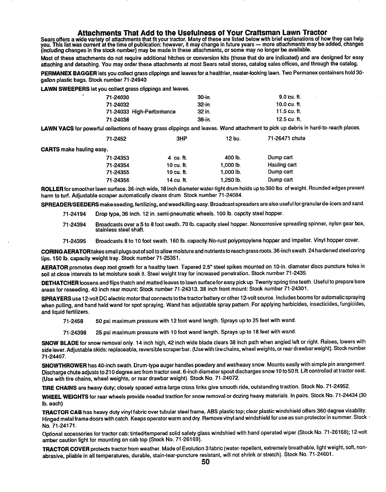 Sears offers a wide variety of attachments that fit your tractor. Many of these are listed belowwith brief explanations _howthey can help