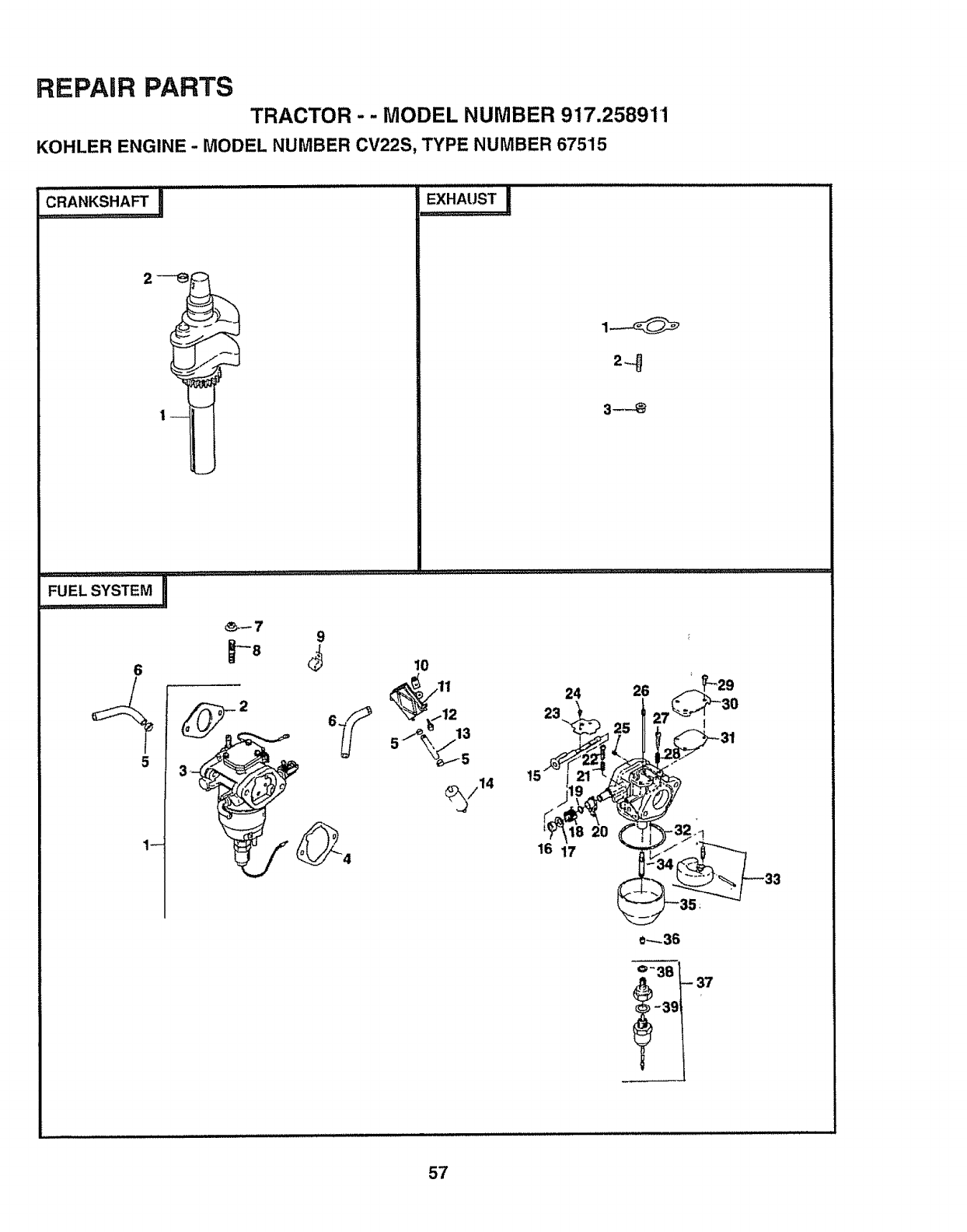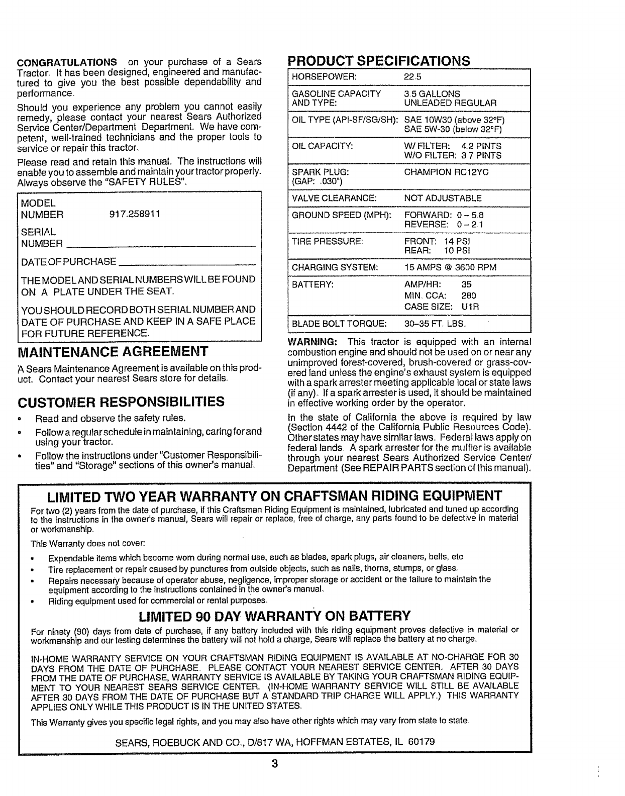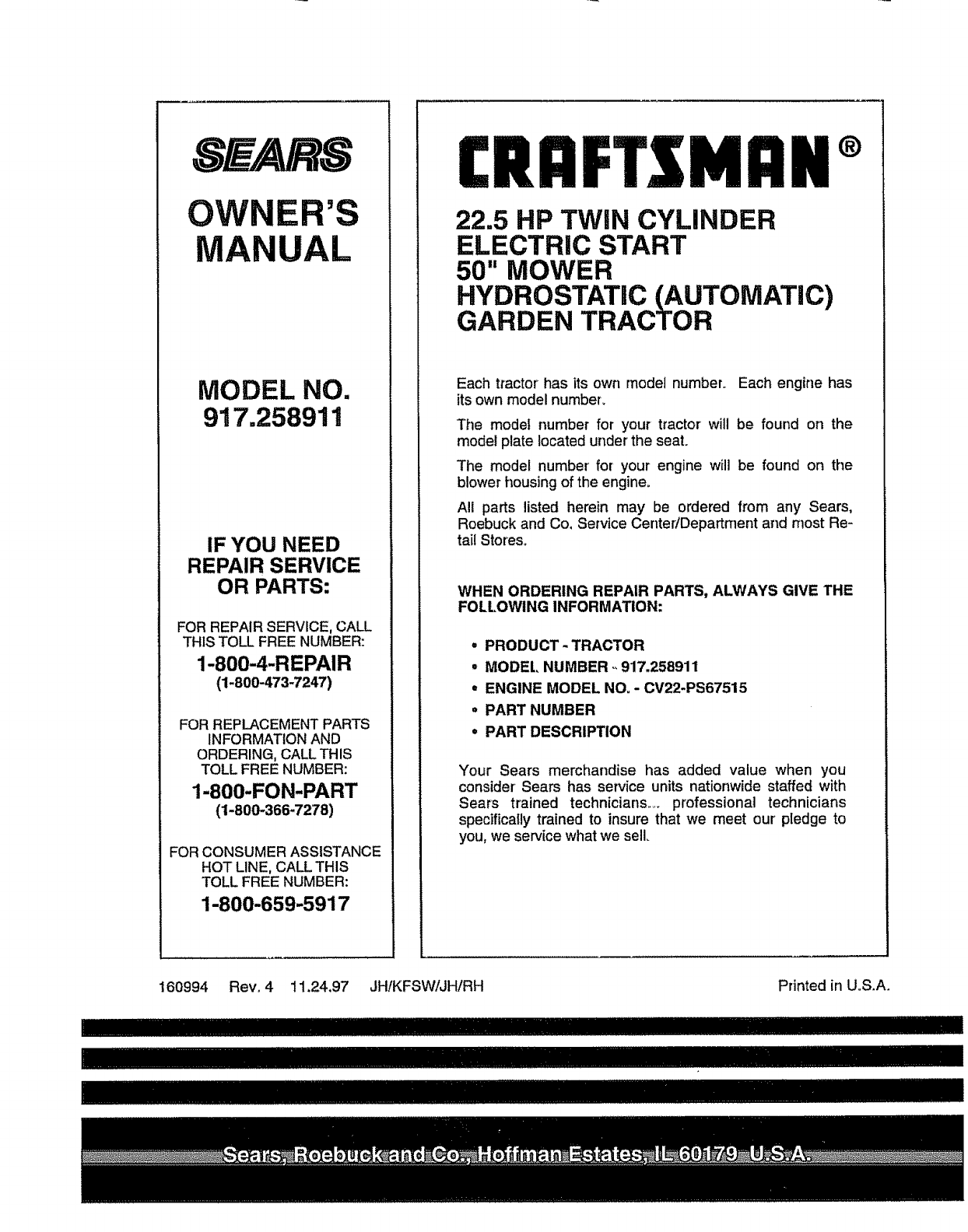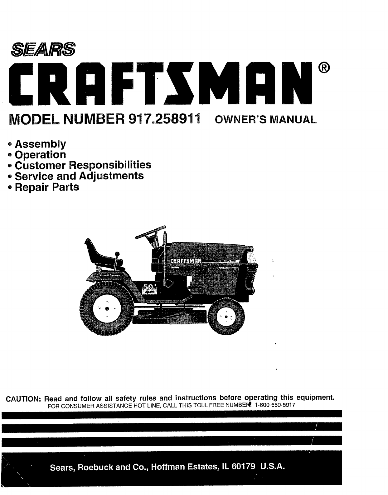 917258911 917258911 CRAFTSMAN TRACTOR - Manuals and Guides L0909447 View the owners manual for your CRAFTSMAN TRACTOR #917258911. Home:Lawn & Garden Parts:Craftsman Parts:Craftsman TRACTOR Manual