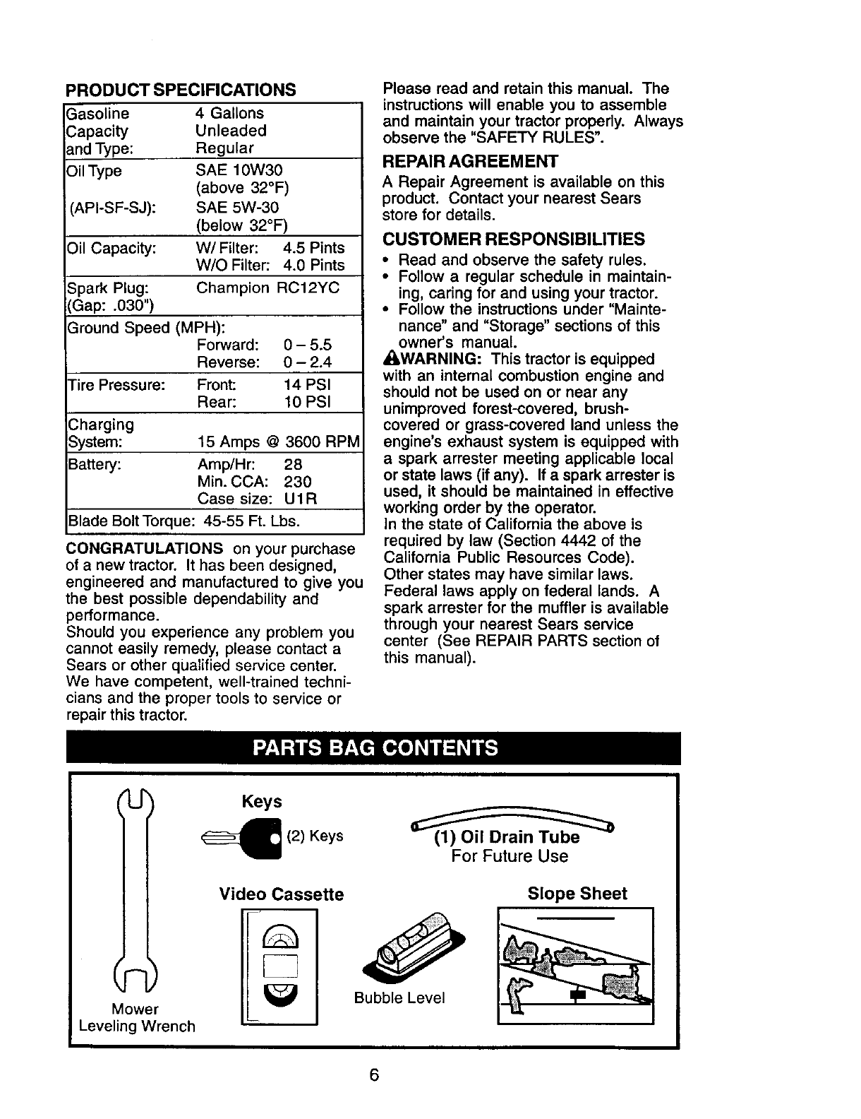 manual, Sears will repair or replace free of charge any parts that are found to be