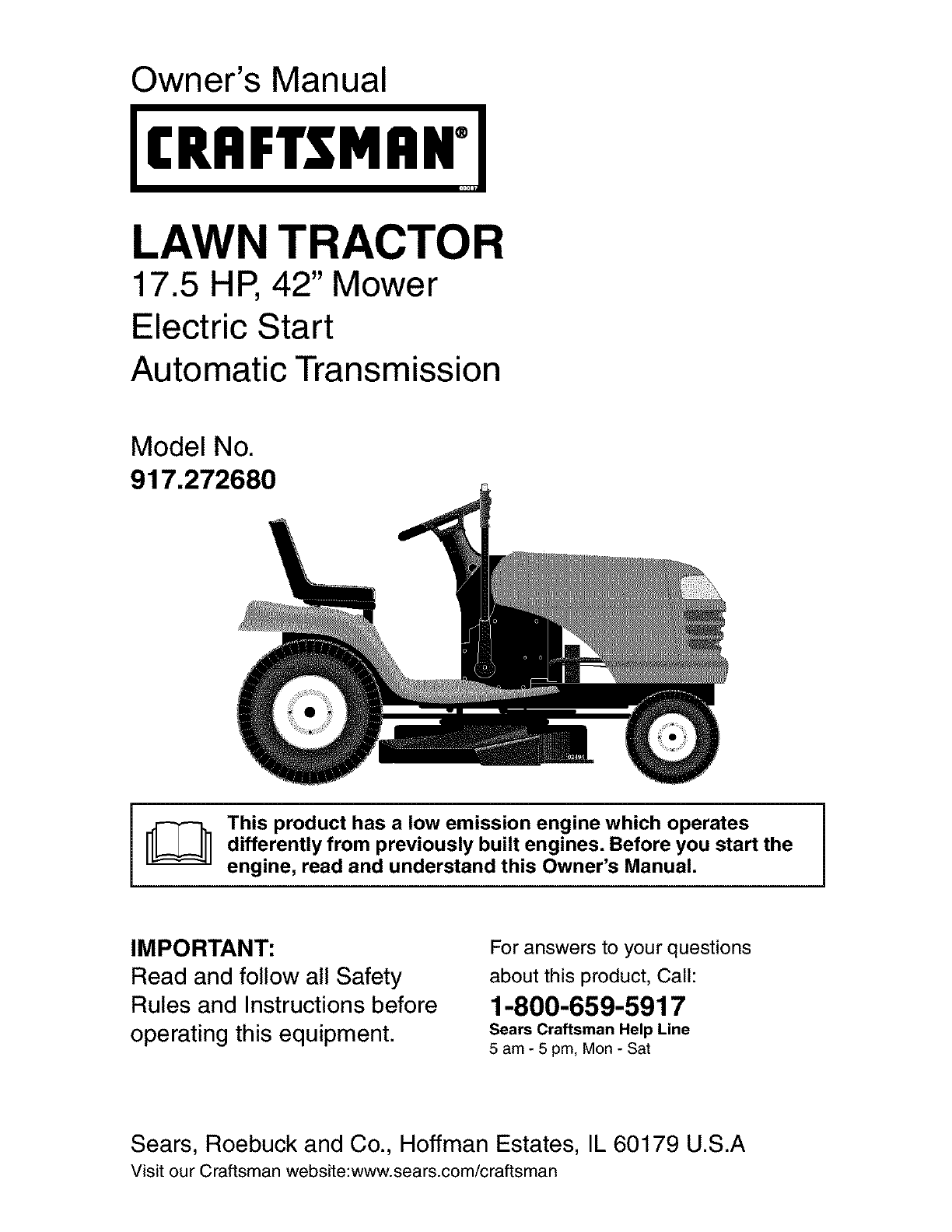 917272680 917272680 CRAFTSMAN LAWN TRACTOR - Manuals and Guides L0305003 View the owners manual for your CRAFTSMAN LAWN TRACTOR #917272680. Home:Lawn & Garden Parts:Craftsman Parts:Craftsman LAWN TRACTOR Manual